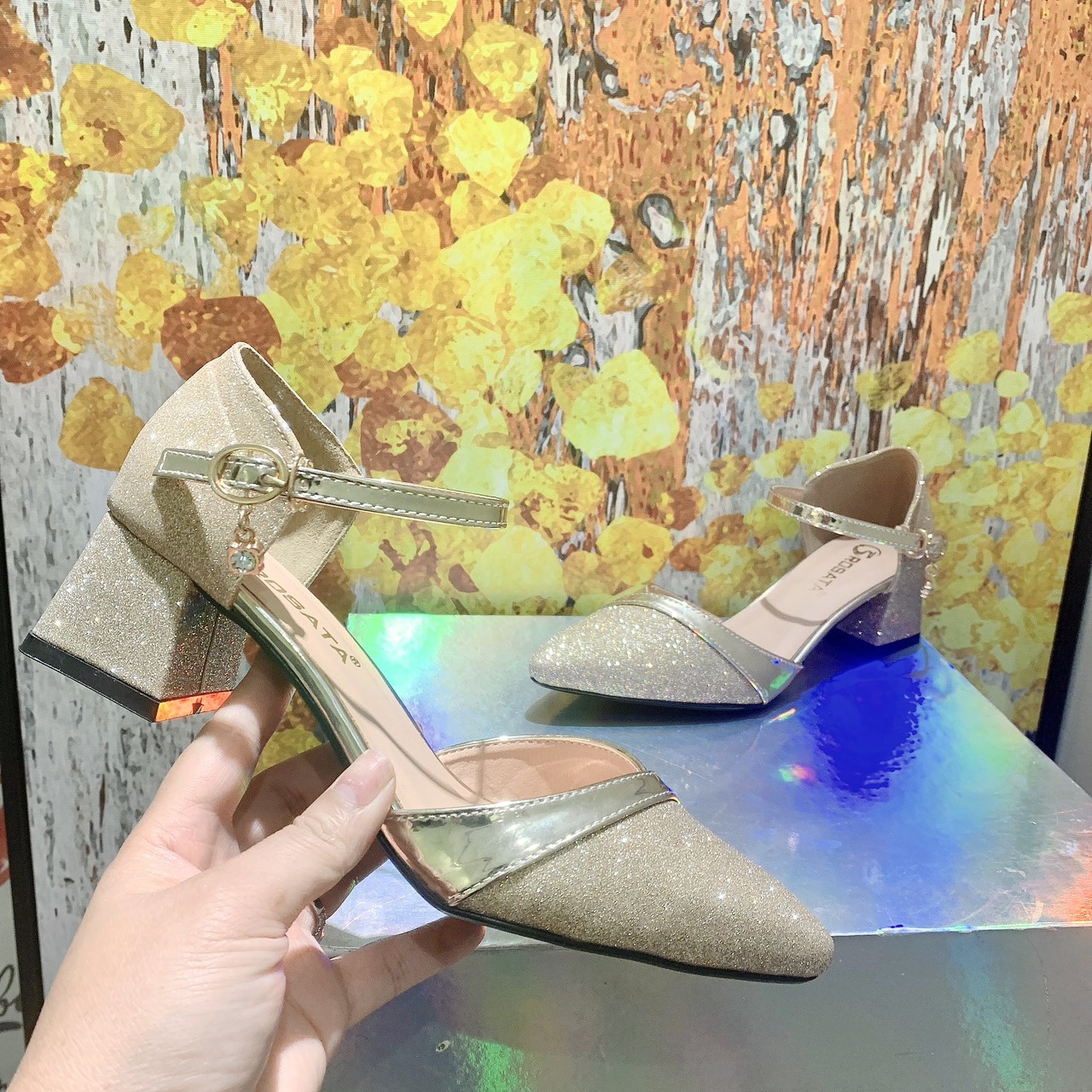 MÔ TẢ SẢN PHẨM: Giày cao gót nữ bít mũi, hở gót, da bóng ROSATA RO654 - 9p - Đen, Vàng - HÀNG VIỆT NAM - BKSTORE Giày được làm từ chất liệu da PU