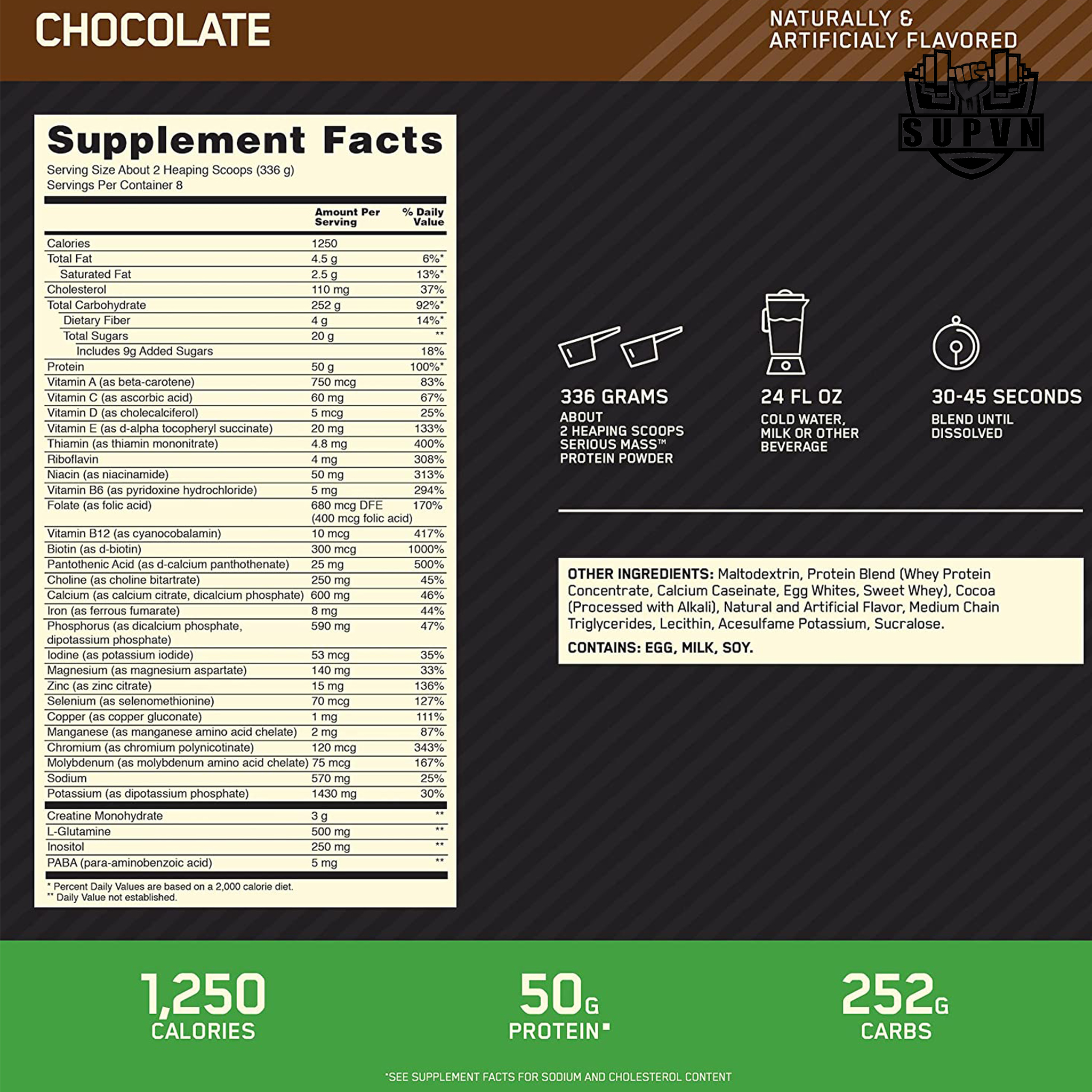Đánh giá Serious Mass từ Optimum NutritionCông thức mà Optimum Nutrition áp dụng cho sản phẩm sữa Mass cao cấp của mình bao gồm 50g Protein tinh sạch và 1250 Calo năng lượng cho mỗi khẩu phần. Nguồn...