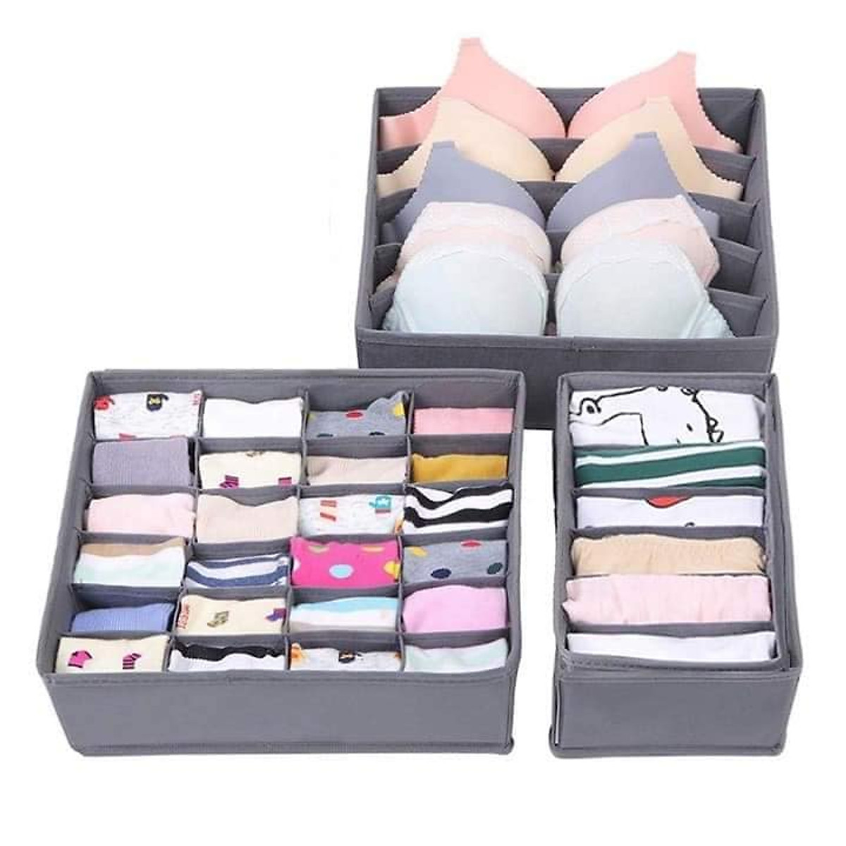 Set 3 Hộp Đựng Đồ Lót Túi Đựng Đồ Lót, Tất Vớ, Đựng Đồ Đa năng Gấp Gọn Đa Năng - Hàng Loại 1 - Chính Hãng MINIIN Các hộp vải được chia ngăn khoa học, giúp sắp xếp đồ nhỏ của nhà mình thiệt là ngay ngắn, đúng form, không xô lệch. Khi không sử dụng, hộp có thể được xếp lại dẹt như 1 tờ giấy, nên rất tiện cho việc lưu trữ. Chất liệu vải không dệt thân thiện môi trường và dễ vệ sinh nếu bị bẩn. Một bộ sản phẩm gồm: 1 hộp đựng bra chia 7 ngăn, 1 hộp đựng quần lót chia 6 ngăn, 1 hộp đựng vớ chia 20 ngăn. Ngoài ra bạn cũng thể dùng đựng các phụ kiện thời trang nhỏ khác, tùy theo nhu cầu mỗi người. Hiện có các màu: xám, xanh và hồng Kích thước: Hộp đựng bra 7 ngăn: 33289cm Hộp đựng vớ 20 ngăn: 33289cm Hộp đựng quần lót 6 ngăn: 33169cm