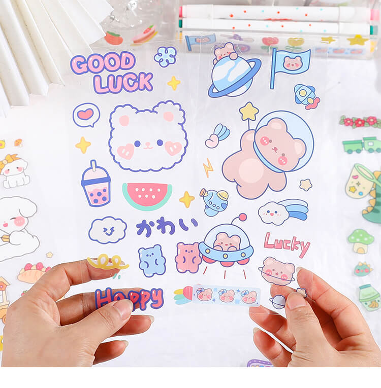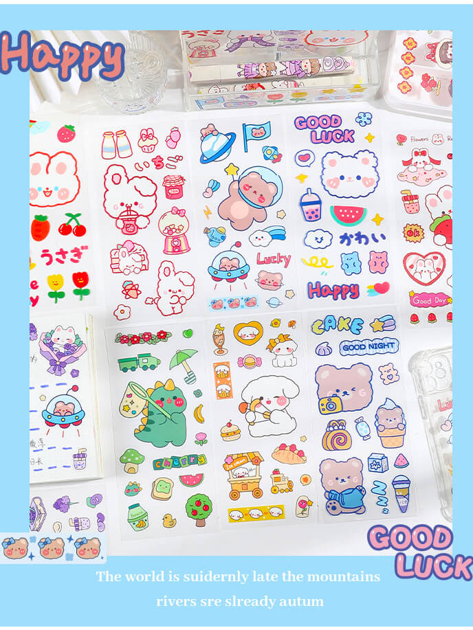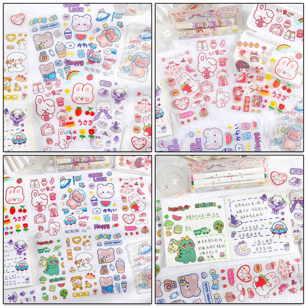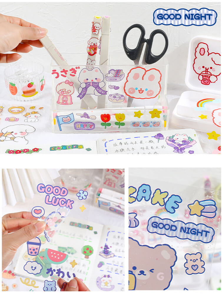 ✨SET 6 Tờ 90 Nhãn Dán Sticker Thỏ Gấu Chuột PET Trong Suốt Cute Không Thấm Nước Trang Trí Dễ Thương