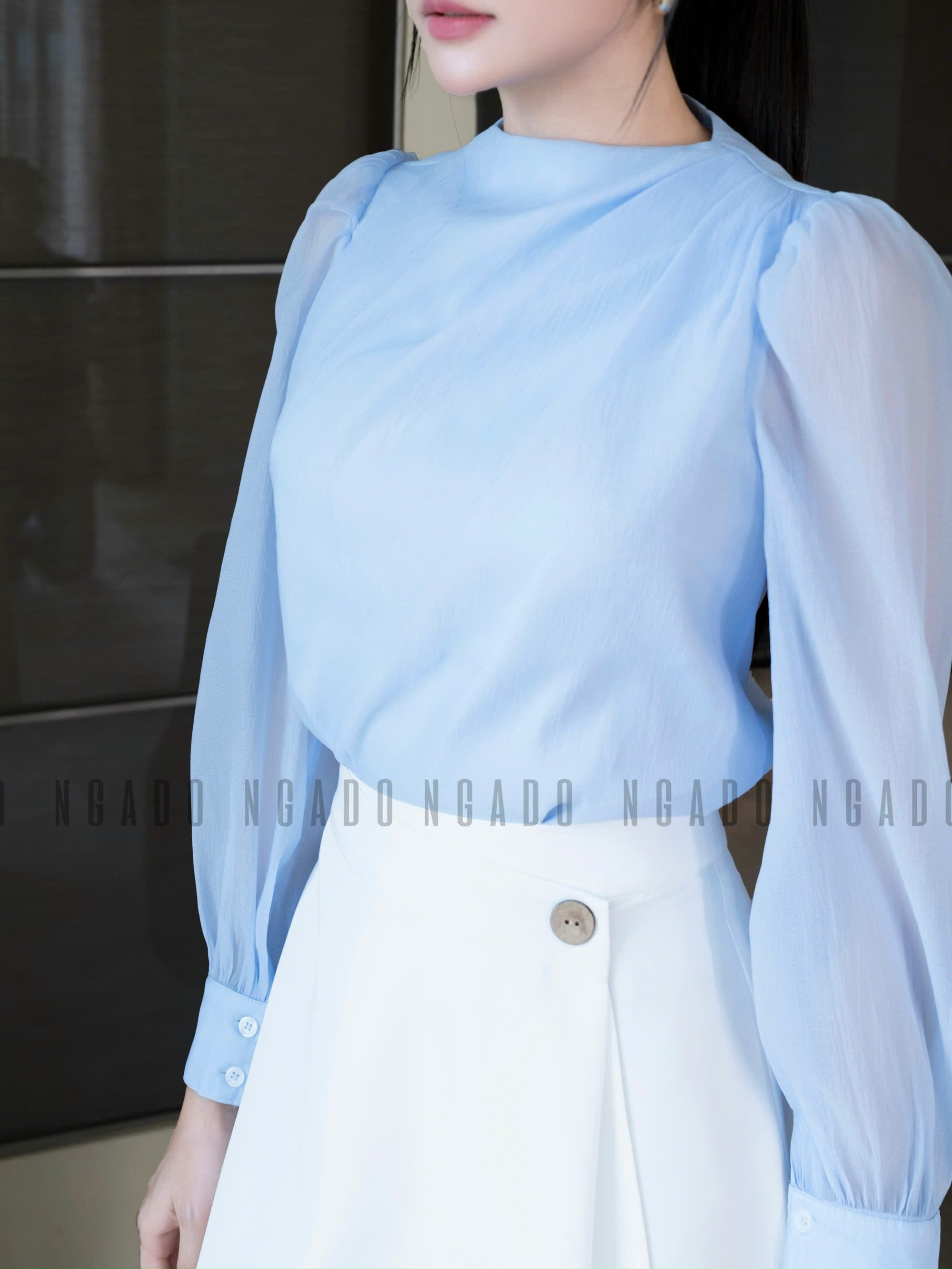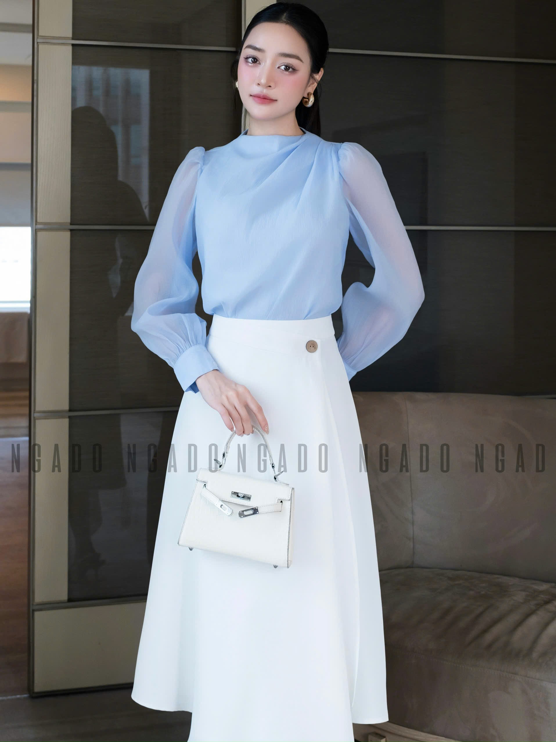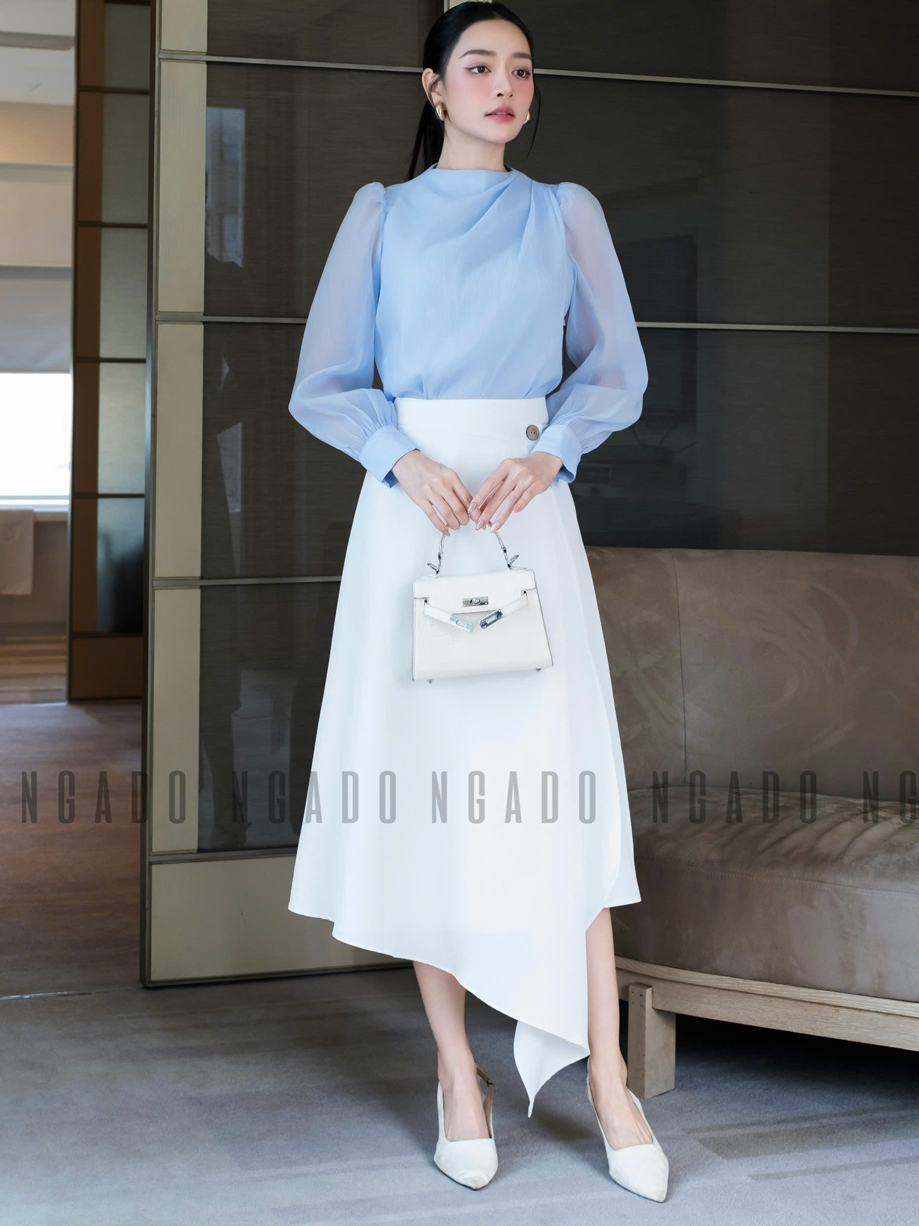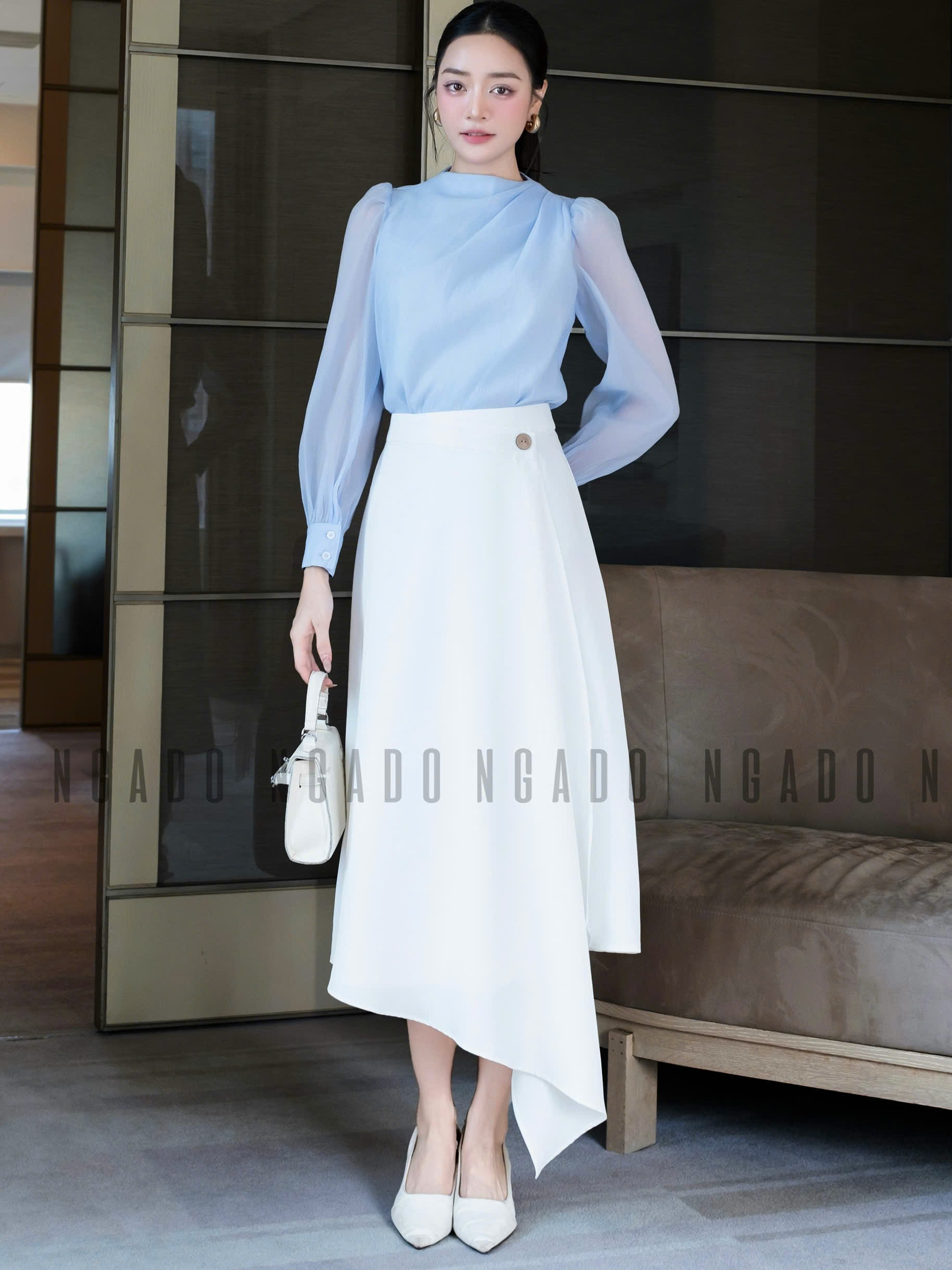 ✨Set áo voan xanh váy trắng NGADO , set áo váy dài , set công sở
