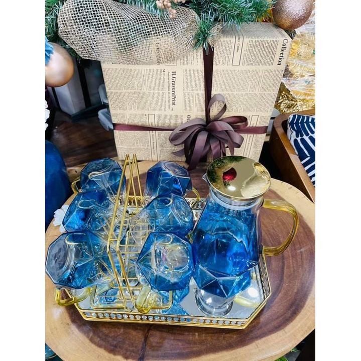 ✨Sét bình đựng nước uống thủy tinh chịu nhiệt cao cấp màu xanh nước biển vân kim cương kèm khay và giá úp