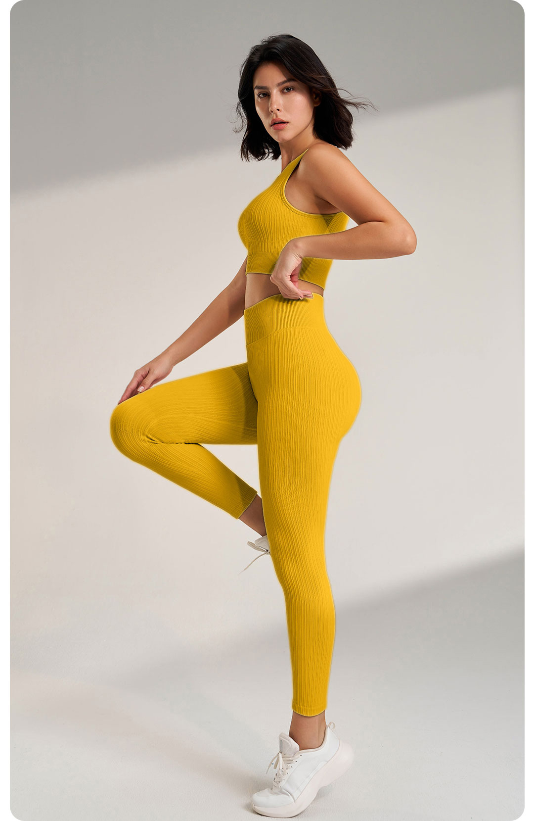 Chất liệu : thun dệt gân dày dặn, co giãn 4 chiều , thoáng khí , thấm mồ hôi tốt Kiểu dáng : quần ngắn cạp cao , áo 2 dây , phần mông có
