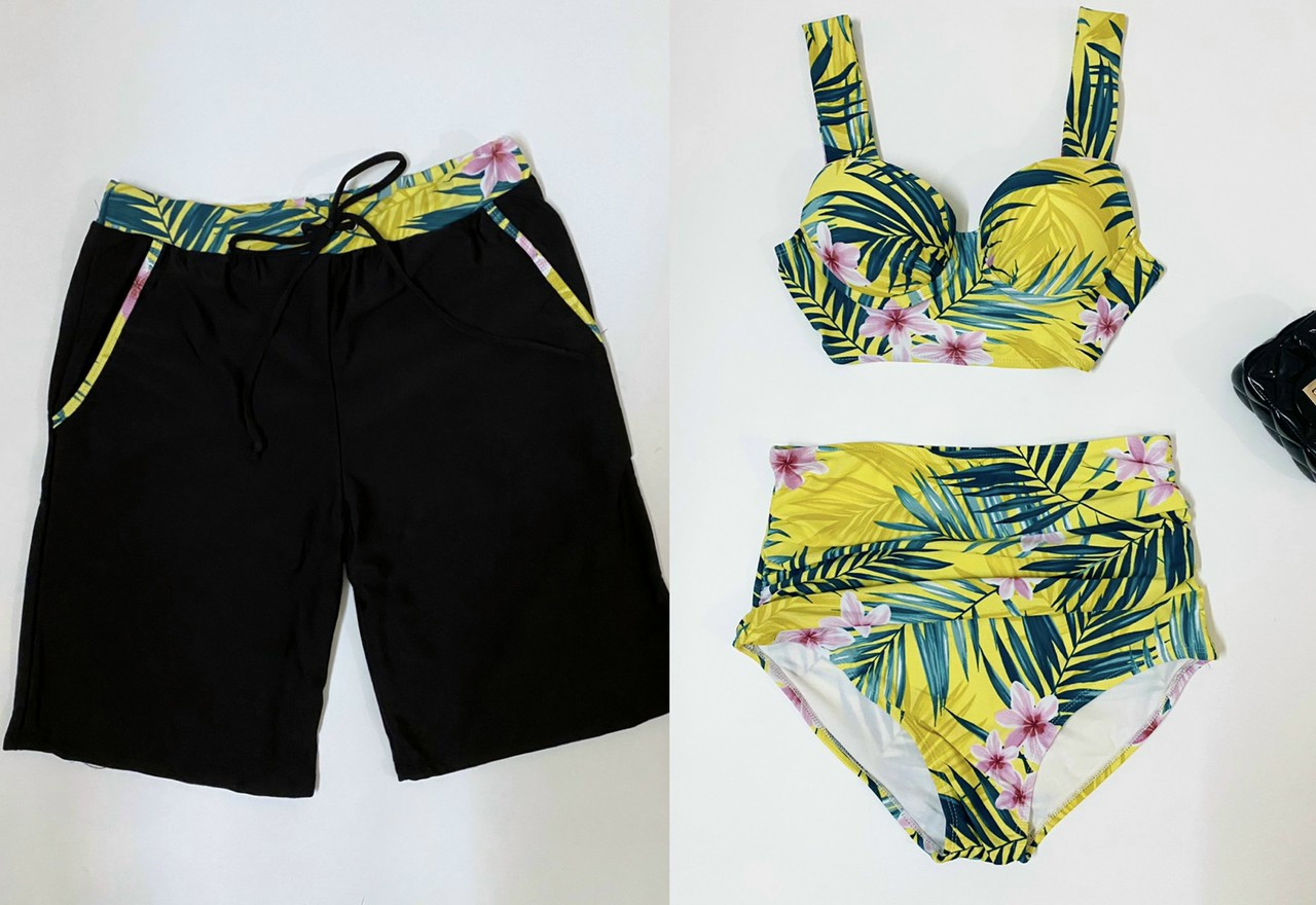 - Mẫu đồ bơi kín đáo với áo dài tay + quần short lửng, chống nắng tốt mà vẫn tôn dáng cho các bác tuổi trung niên. - Thiết kế 3 chi tiết với 2