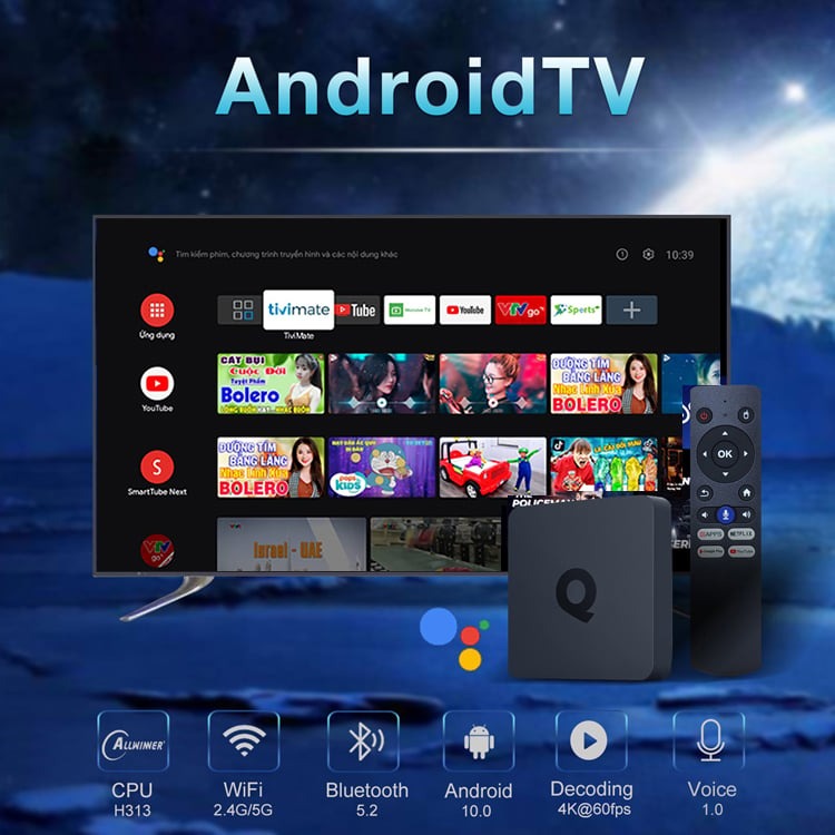 Smart box android tv Q mới có điều khiển giọng nói tiếng việt hỗ trợ bluetooth Wifi băng tần kép Cài sẵn chương trình tivi và xem phim HD miễn phí vĩnh viễn Nhằm đáp ứng nhu cầu khách hàng cần giá thành hợp lý , Hãng cho ra đời Android Smart TV Q Phiên bản mới Điều khiển giọng nói bằng tiếng Việt RAM: 2GB ROM: 8G Bluetooth Wifi kép 2.4G & 5G , chip wifi mới Hệ điều hành Android 10 Cài sẵn ứng dụng xem phim, tivi truyền hình cáp miễn phí vĩnh viễn Chống lag và giật khi sử dụng, thời gian khởi động nhanh Cài đặt sẵng kho ứng dụng miễn phí xem phim, karaoke, đọc báo, lướt web, coi truyền hình Xem truyền hình cáp trên 150 kênh miễn phí vĩnh viễn Karaoke suốt cả ngày với các ứng dụng Karaoke chuyên nghiệp đã được cài đặt sẵn. Có thể cắm Amply , Hát Karaoke, Thay thế đầu PS kết nối loa không dây   Trên thị trường Android Tivi Box hiện nay, nếu nhắc đến loại sản phẩm có giá thành rẻ thì không thể không nhắc đến dòng sản phẩm Android Tivi Box q , với giá thành hiện tại chỉ khoảng dưới 1 triệu đồng. Mặc dù giá thành rẻ, tuy nhiên cấu hình của nó cũng có thể nói là chấp nhận được, thậm chí còn đáp ứng khá tốt các nhu cầu vượt mức bình thường của những người sử dụng khó tính. Sự ra đời của dòng sản phẩm chắc chắn sẽ lại một lần nữa khuấy động thị trường Android Tivi Box giá rẻ, chúng ta cùng hiểu sâu hơn về chiếc Android này để xem những bước đột phá và cải tiến mới sẽ như thế nào. I –  THIẾT KẾ CỰC NHỎ GỌN Ngoài chipset đi kèm với 2GB RAM và 8GB bộ nhớ eMMC. Kích thước là rất nhỏ  8.2 x 8.2 x 1.7cm . thiết bị cũng chạy trên Android tv 10 Phiên bản quốc tế 64 ngôn ngữ có tiếng Việt Hiệu năng cao với thế hệ chip mới Hệ điều hành: android TV Tính năng Google Assistant (Tìm kiếm bằng giọng nói): Chỉ cần nói mở Youtube sản phẩm sẽ tự vào chương trình hoặc bất cứ tên một bài nhạc nào quý khách không cần nhập từng ký tự     Phiên bản cao cấp Android 10 mới