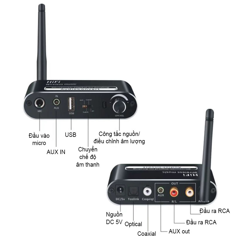 Tính năng: Bộ thu âm thanh tương thích với Bluetooth, bộ chuyển đổi âm thanh kỹ thuật số sang tương tự, bộ điều hợp phát lại đĩa flash USB. Có dây thành không dây, biến