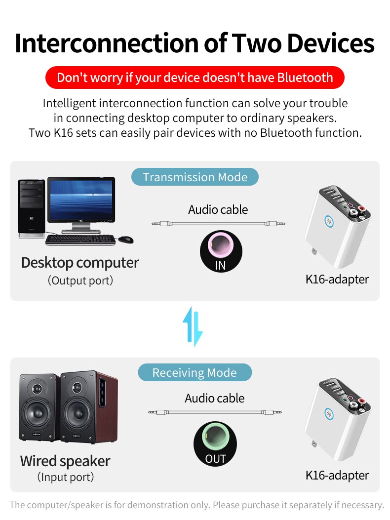 Thiết bị thu phát không dây K16 hỗ trợ chuyển đổi tín hiệu âm thanh đầu ở vào như Bluetooth, thẻ TF, đĩa USB, AV3.5 từ các nguồn tivi, âm ly, máy tíển đổi đầu ra các ngõ âm thanh RAC, AV3.5, Bluetooth Đầu ra giao diện kép AUX + RAC, có thể kết nối 2 loa và thiết bị khác cùng lúc