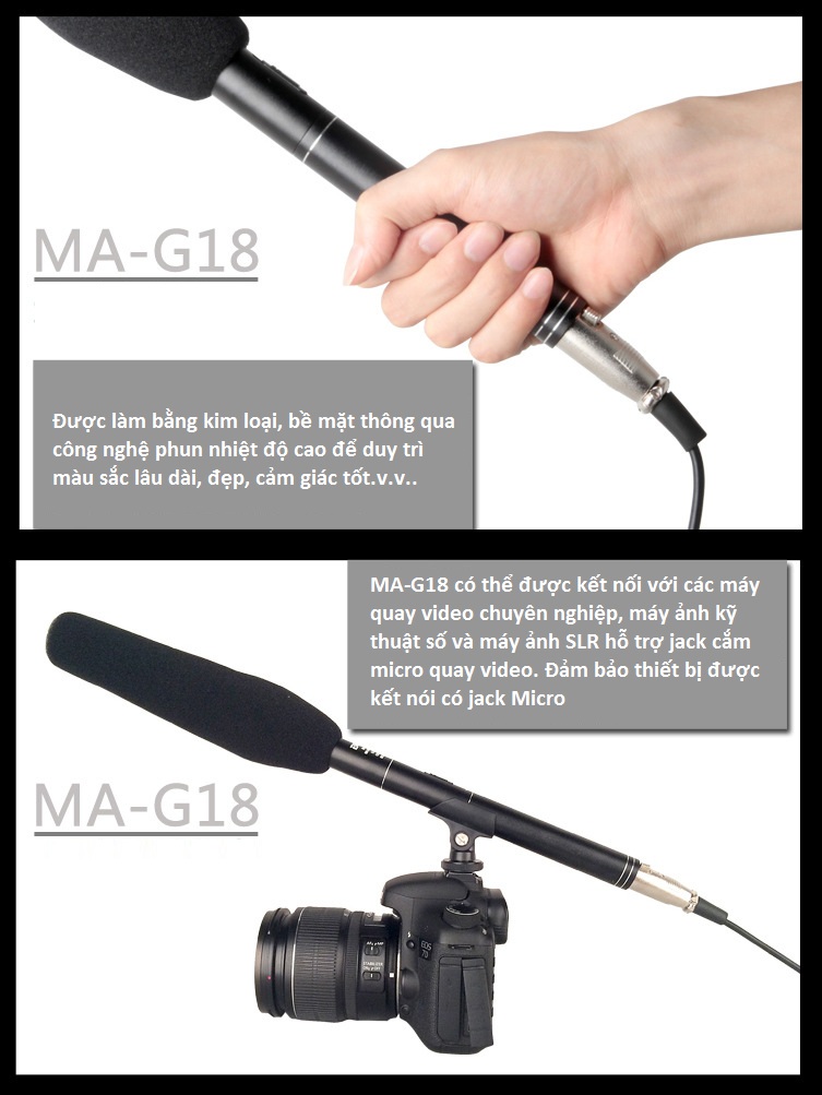 Micro thu âm BUB MA-G18 chính hãng là dòng sản phẩm Micro chuyên sử dụng cho các loại máy quay phim, máy ảnh kỹ thuật số, máy ảnh cơử dụng để thu âm quay phim