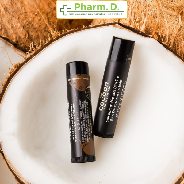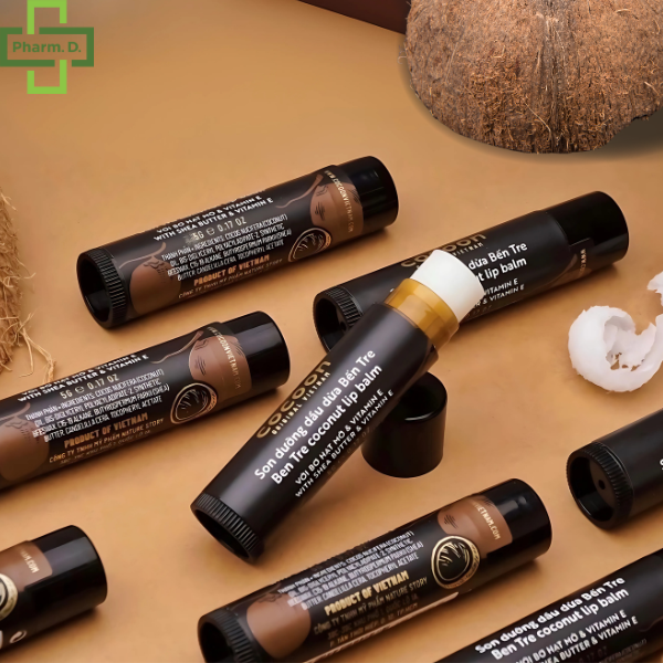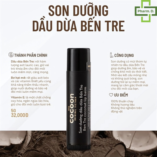Công dụng • Son dưỡng có mùi thơm tự nhiên từ dầu dừa Bến Tre giúp dưỡng ẩm, bảo vệ và chống khô môi do thời tiết. Nhờ vào kết cấu mỏng nhẹ và không quá