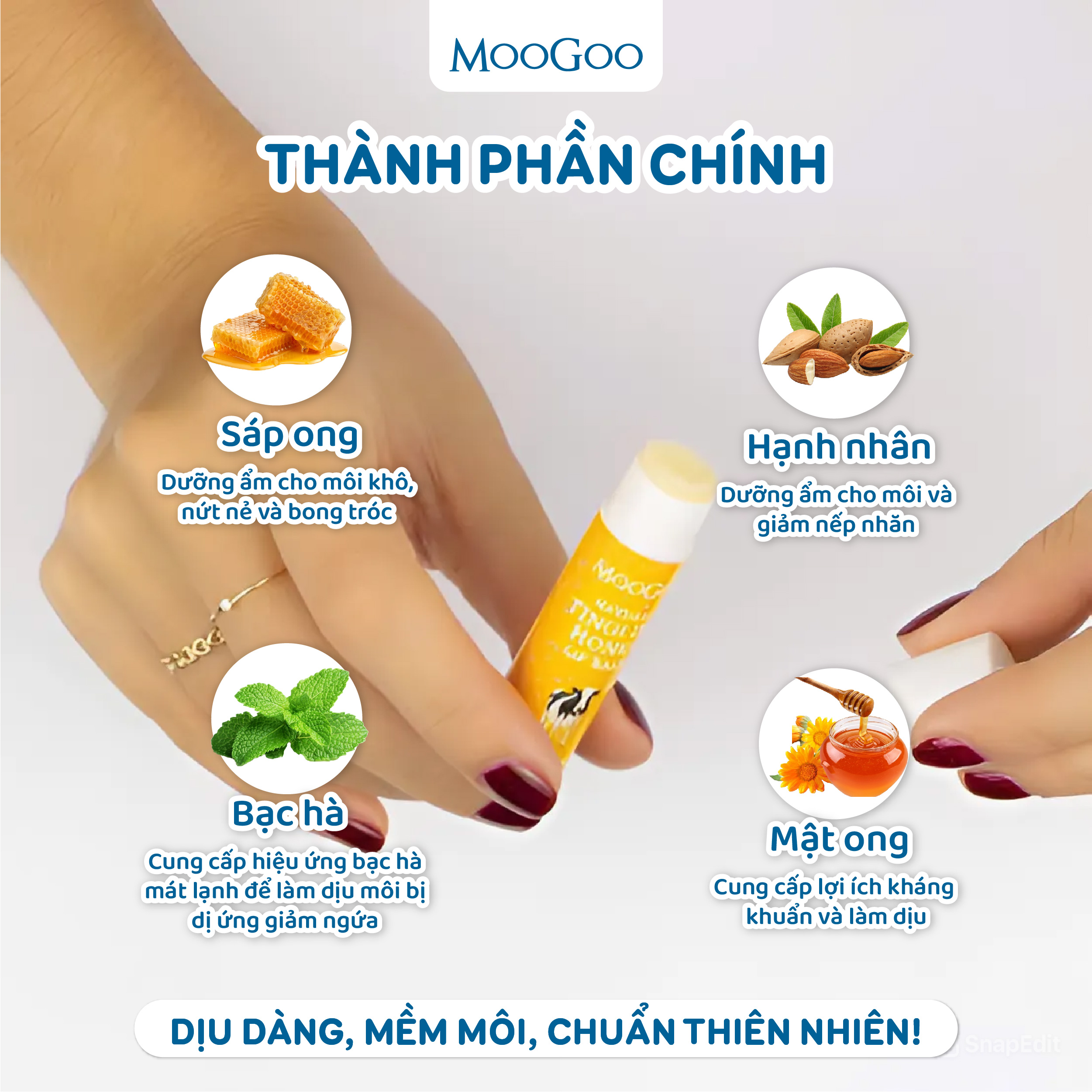Son dưỡng môi MooGoo với các thành phần từ thiên nhiên thuần khiết, chăm sóc hằng ngày cho đôi môi mềm mại và mịn màng. ✓ Thành phần tốt cho sức khỏe ✓ Có chứa