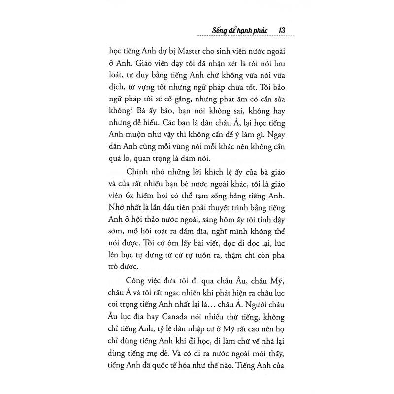 Sống Để Hạnh Phúc Cuốn sách là một chuỗi những cuộc trò chuyện giản dị của cô Nguyễn Hoàng Ánh về nỗi bất an của xã hội này: Trăn trở làm người, tìm ra được giá trị của bản thân, và mục đích chúng ta sống! Đây là những chia sẻ hết sức hữu ích dành cho các bạn trẻ và bậc làm cha mẹ, giúp chúng ta trả lời các câu hỏi: -Có nên học trường chuyên? -Chúng ta có thực sự đặc biệt không? -Thế nào là học giỏi, thế nào là thành công? -Làm giáo viên sướng hay khổ? -Vì sao đi du học? -Con cái chúng ta có thực sự có quyền sống hay không? Ta mong đợi và gửi gắm rất nhiều vào giáo dục Việt Nam, nhưng chúng ta cũng buộc phải tìm cách tự trả lời những câu hỏi trước cánh cửa cuộc đời. Du học, bằng cấp, niềm say mê, ước mơ trên ghế giảng đường, cuộc sống náo nhiệt từ Face book và tâm hồn cô quạnh của giới trẻ… Mỗi bài viết trong Born to be happy đều có khả năng khơi gợi bạn tự tìm ra nhiều cách trả lời khác nhau cho cuộc sống phía trước! Tác giả Nguyễn Hoàng Ánh kêu gọi giới trẻ ước mơ, và băn khoăn về những vị phụ huynh mãi không chịu trưởng thành. Cuộc sống học đường trong cuốn sách thực ra là một hành trình tự định vị bản thân, dũng cảm trải nghiệm sống, không ngừng mơ ước của tác giả. Tác giả Nguyễn Hoàng Ánh được hàng chục ngàn sinh viên ĐH Ngoại Thương yêu quý, cũng là người dẫn dắt, tạo cảm hứng, khích lệ rất nhiều bạn trẻ vững tin vào cách mình sống và mình cống hiến. Đọc sách và dũng cảm lên, vì chúng ta vốn sinh ra để sống hạnh phúc! (Nhà văn Trang Hạ) Tên Nhà Cung Cấp Alpha Books Tác giả Nguyễn Hoàng Ánh NXB NXB Hồng Đức Năm XB 02-2017 Số trang 220 Hình thức Bìa Mềm Sản phẩm bán chạy nhất Top 100 sản phẩm Kỹ năng sống bán chạy của tháng