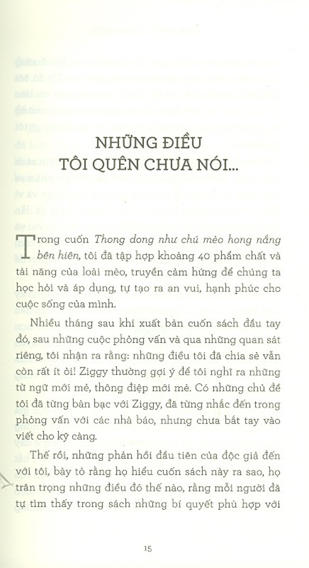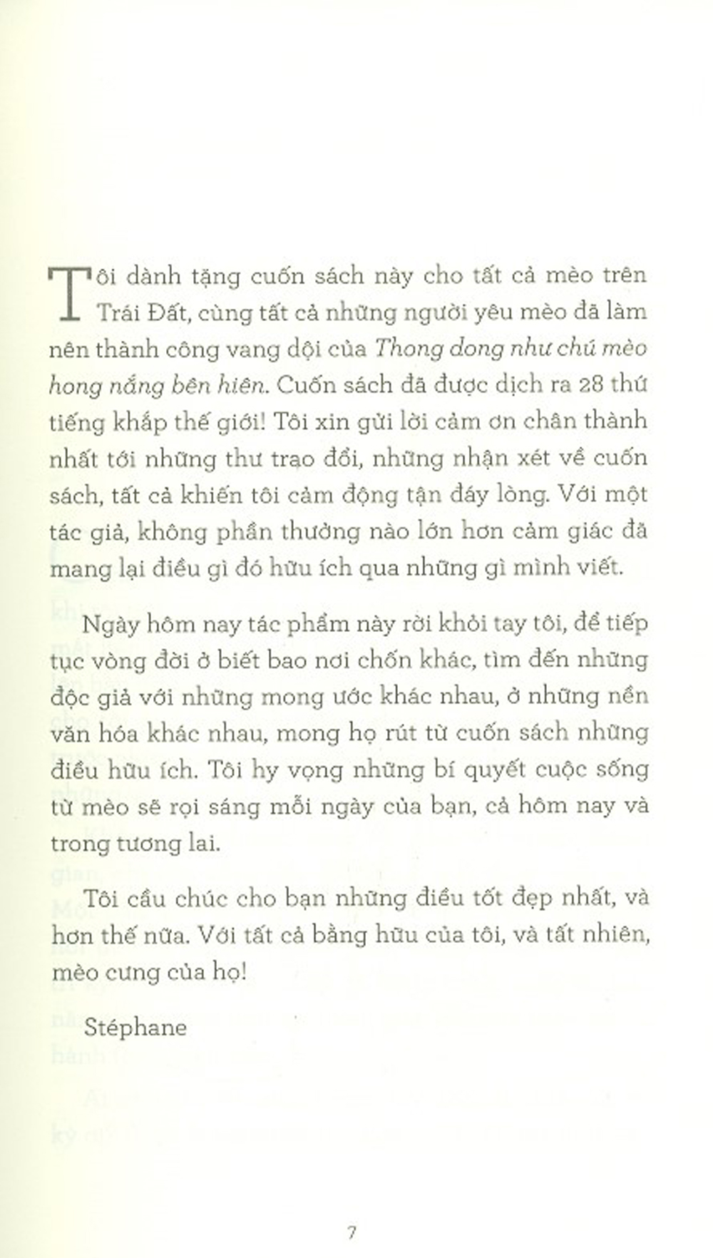 Trong cuốn "Thong dong như chú mèo hong nắng bên hiên", tác giả Stephane Garnier đã tập hợp khoảng 40 phẩm chất và tài năng của loài mèo, truyền cảm hứng để chúng ta học hỏi và áp dụng, tự tạo ra an vui, hạnh phúc cho cuộc sống của mình.