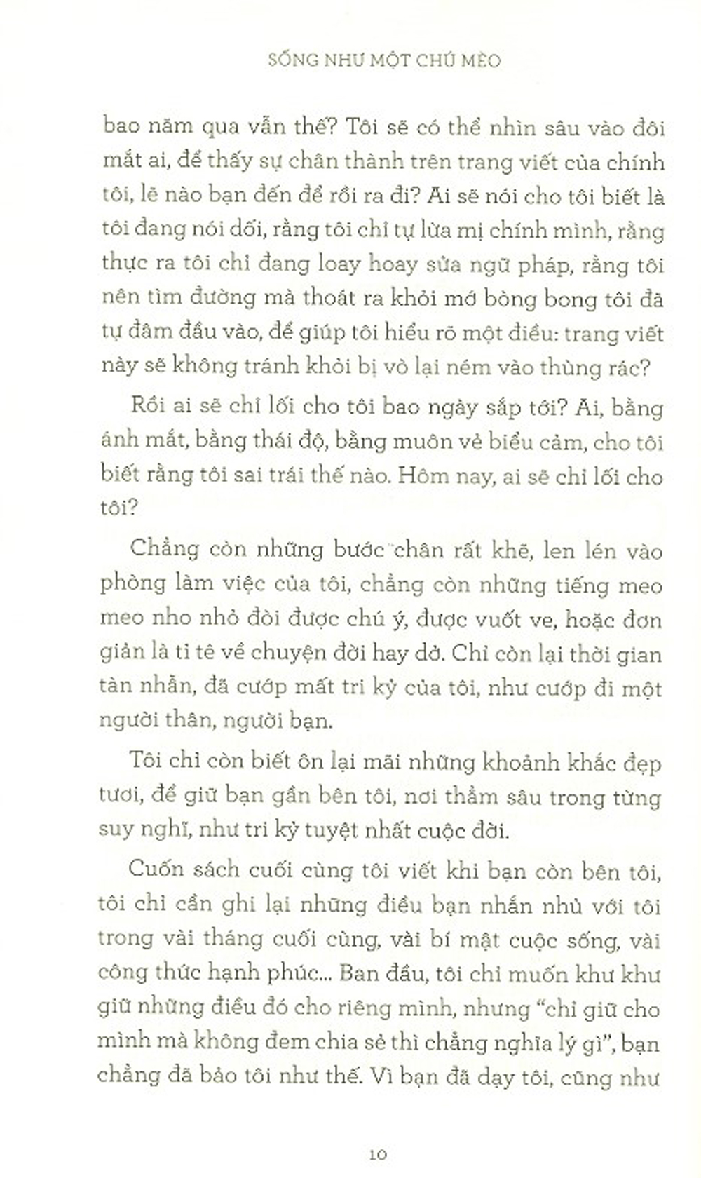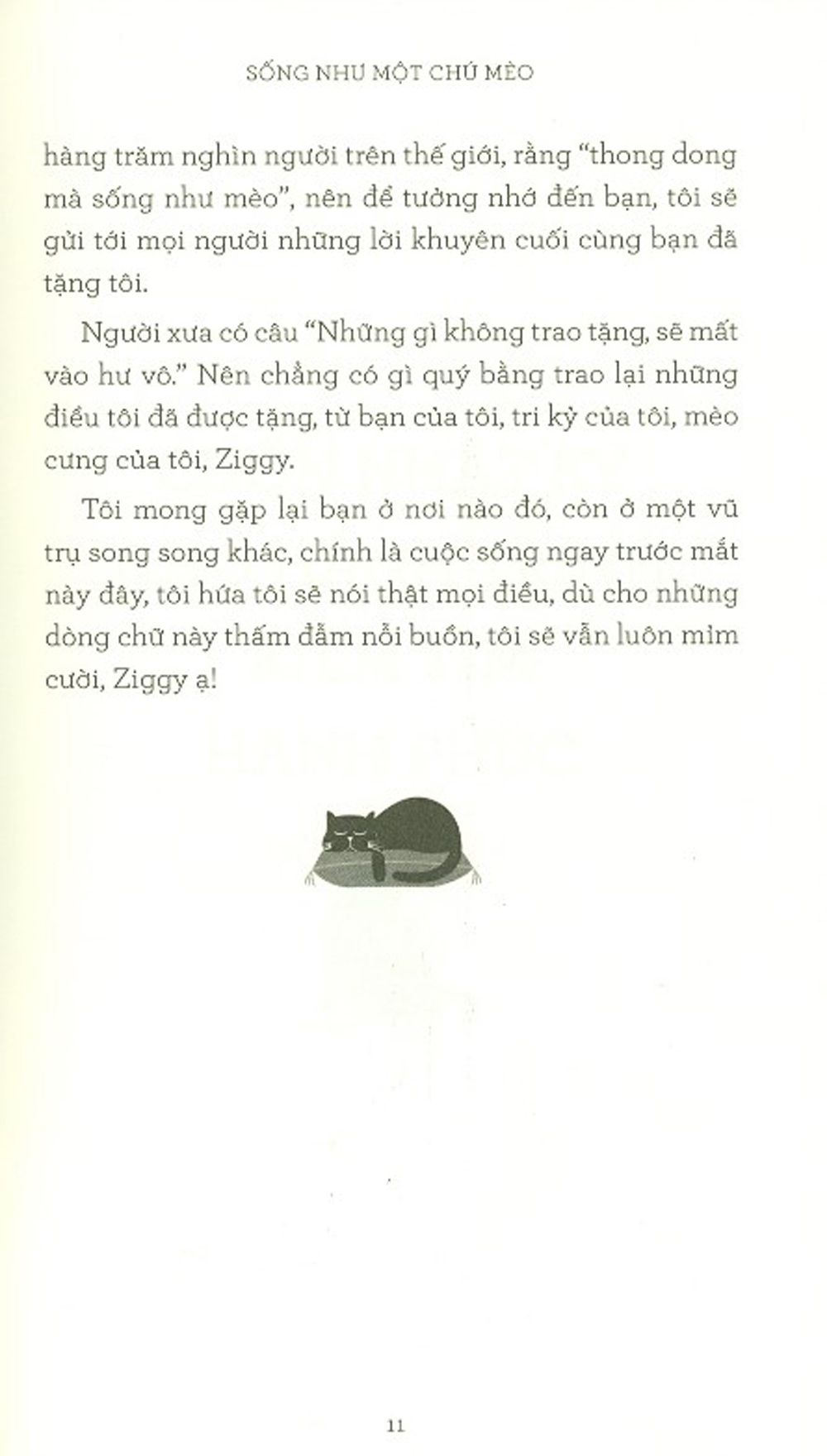 Phần 2, Sống Như Một Chú Mèo, là cuốn nhật ký cho hành trình kiếm tìm hạnh phúc, không chỉ mang tới cho độc giả những quan sát của riêng tác giả về mèo, mà cả những suy ngẫm về con người. Điều quan trọng ở đây không phải là cố “lấy bụng người đo lòng mèo”, bắt một con mèo nói lên những điều trái với cảm nhận của nó, mà là lắng nghe những gì mèo thầm thì, thể hiện qua thái độ của mèo với con người mỗi ngày, những điều đó khiến ta hạnh phúc hơn. Cuốn nhật ký này sẽ mở rộng hơn những bí quyết mang lại niềm an vui, để ta bước vào một hành trình thong dong mà mèo dẫn ta đi để đến với hạnh phúc.