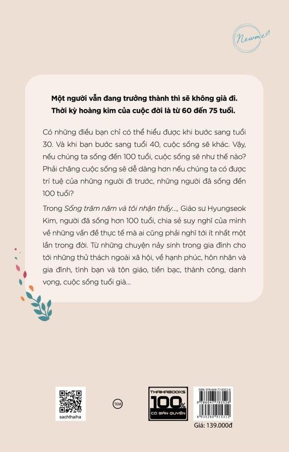 Trong Sống trăm năm và tôi nhận thấy…, Giáo sư Hyungseok Kim, người đã sống hơn 100 tuổi chia sẻ suy nghĩ của m.ình về những vấn đề thực tế mà ai cũng phải nghĩ tới ít nhất một lần trong đời. Từ những chuyện nảy sinh trong gia đình cho tới những thử thách ngoài xã hội, về hạnh phúc, hôn nhân và gia đình, tình bạn và tôn giáo, tiền bạc, thành công, danh vọng, cuộc sống tuổi già…