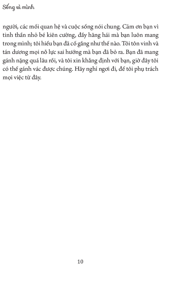Sống Vì Mình Bạn có cảm thấy bất hạnh không? Bạn có cảm thấy bị đối xử tàn tệ không? Bạn có xu hướng nỗ lực rất nhiều trong mối quan hệ không? Bạn có kiệt quệ hay cạn năng lượng không? Bạn có cảm thấy không được trân trọng không? Bạn có đang làm việc quá sức không? Hay bị trả lương quá thấp không? Nếu câu trả lời là có cho một hoặc nhiều câu hỏi ở trên, cuốn sách này là dành cho bạn! Nếu bạn nhận ra những cảm giác này hoặc thấy mình ở trong bất cứ tình trạng nào như đã kể trên mà không thể thoát ra, đã đến lúc tự hỏi bản thân rằng mình đang cho phép điều gì xảy ra? Sự thật khó chấp nhận là, không có tình trạng nào trong số những tình trạng kể trên có thể tồn tại lâu dài mà không có sự cho phép của bạn. Nếu bạn đang ở trong những tình huống hoặc mối quan hệ chỉ đem lại cảm giác tiêu cực, thì có nghĩa là bạn đang tiếp tay hoặc chấp nhận một điều gì đó. Những trạng thái dài hạn này không ngẫu nhiên xảy ra mà cần đến sự thuận theo của họ. Cuốn sách là hành trình hướng vào các tổn thương bên trong Cuốn sách SỐNG VÌ MÌNH là một cuộc hành trình hướng vào bên trong, để bạn nhìn vào những gì bạn đang cho phép xảy ra trong cuộc sống của mình. Cuốn sách là món quà tri thức, sự thấu hiểu và các công cụ để giúp bạn chịu trách nhiệm hoàn toàn cho cuộc sống của mình. Cuốn sách là một hành trình nội tâm của công cuộc khám phá bản thân, sự trung thực và trách nhiệm cá nhân, để soi sáng những góc sâu kín nhất của cảm xúc, suy nghĩ, niềm tin, nhu cầu, thói quen, và khuôn mẫu hành động của bạn. Cuốn sách giúp bạn tự chịu trách nhiệm cho cuộc sống của mình Không phải lúc nào bạn cũng đạt được những gì mình muốn, nhưng như Mick Jagger đã hát: "Nếu thỉnh thoảng cố gắng, bạn sẽ tìm được những gì mình cần." SỐNG VÌ MÌNH, như cái tên của nó, dẫn bạn bước lên con đường tự chịu trách nhiệm cho hạnh phúc của chính mình. Con đường đó dẫn tới đâu? Mời bạn cùng Minh Long khám phá trong cuốn sách này, bạn sẽ không thất vọng!