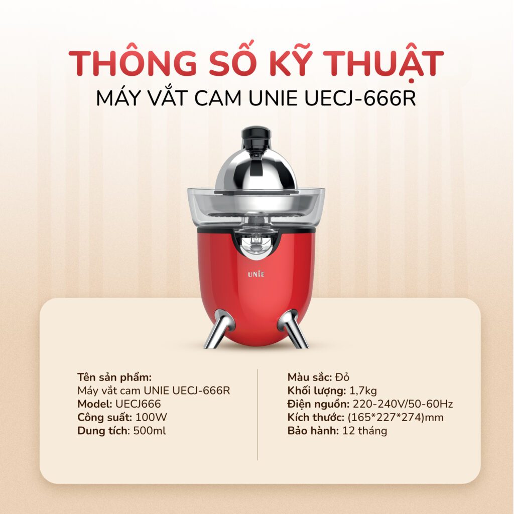 Máy vắt cam UNIE UECJ-666R Vắt kiệt ưu việt, ngọt lành tự nhiên Mang phong cách tân cổ điển sang trọng, UNIE UECJ-666R không chỉ tô điểm cho không gian bếp mà còn mang đến
