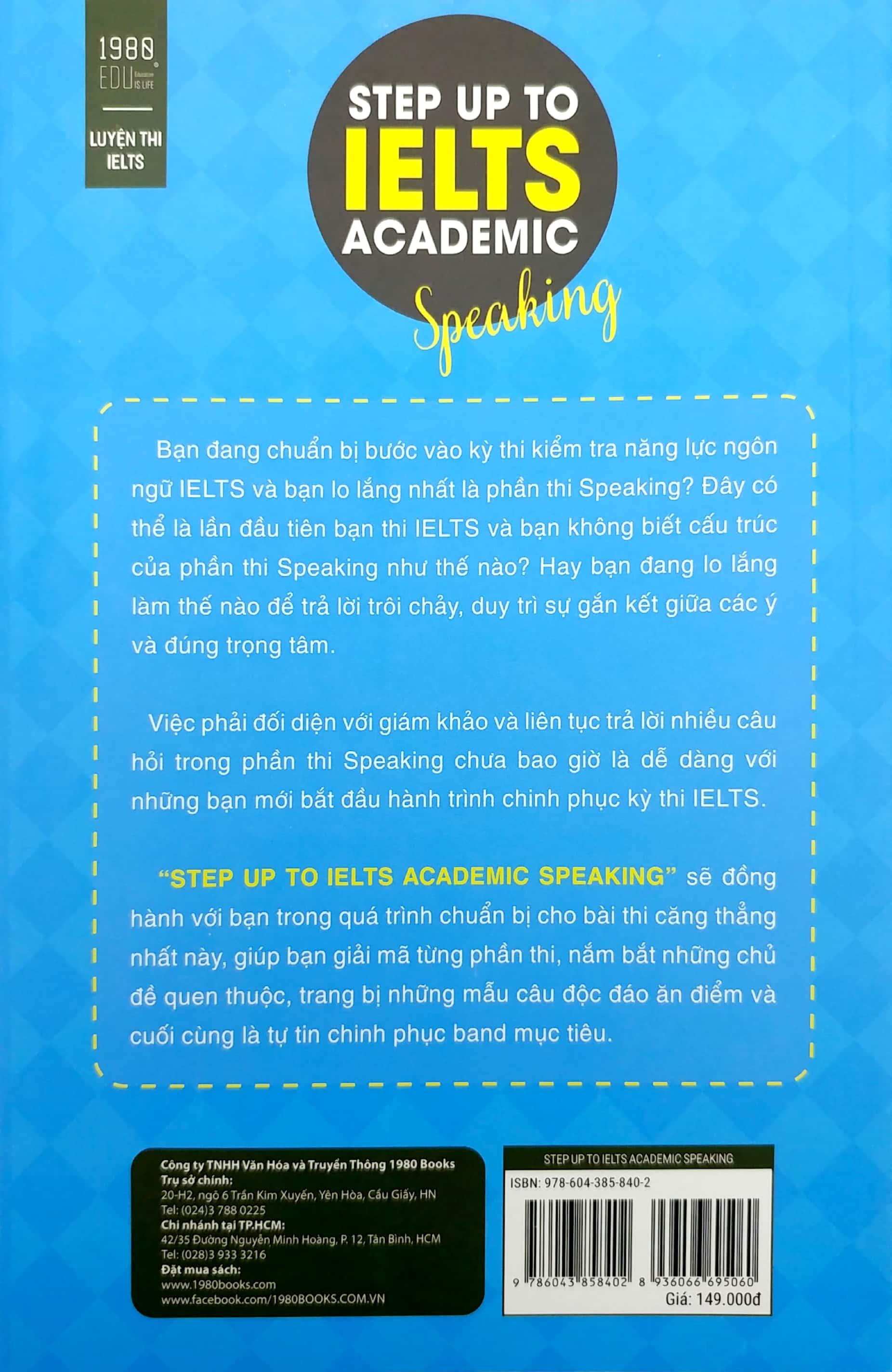 Cuốn sách “Step Up To IELTS Academic SPEAKING” nằm trong bộ sách “Step up to IELTS Academic” là bộ sách gồm bốn kỹ năng “listening/ speaking/ reading/ writing” được cô đọng kiến thức và hỗ trợ tối đa cho thí sinh trong việc làm quen dạng đề và nhận diện dạng bài. Đặc biệt là định hình và xây dựng thói quen, phương pháp học tập hiệu quả để hệ thống kiến thức, dành cho người mới bắt đầu và muốn ôn luyện chuyên sâu; tổng hợp đầy đủ nhất các dạng bài trong đề thi IELTS. Thí sính sẽ dễ dàng nắm bắt được trọng điểm kiến thức để học nhanh nhớ lâu. Hệ thống bài mẫu và ví dụ minh họa chi tiết giúp thí sinh dễ dàng hiểu và tránh được những lỗi sai thường gặp trong quá trình làm bài. Các mẹo hay, tips nhỏ giúp thí sinh có thêm kinh nghiệm khi chinh phục từng kỹ năng của bài thi IELTS. Bên cạnh việc cô đọng kiến thức, bộ sách còn giúp các thí sinh nâng cao vốn từ vựng hay làm quen với cách tính điểm, tiêu chí chấm của giám khảo để từ đó có chiến lược học tập thích hợp. Hệ thống bài tập, bài thi mẫu đa dạng nhiều chủ đề giúp thí sinh đa dạng hơn trong cách viết, rèn luyện kỹ năng nghe chuyên sâu, đọc hiểu nhanh hay xây dựng lập luận chặt chẽ đối với kỹ năng nói, thông qua đó tự đánh giá được năng lực ngoại ngữ của bản thân để có chiến lược học tập hiệu quả hơn.