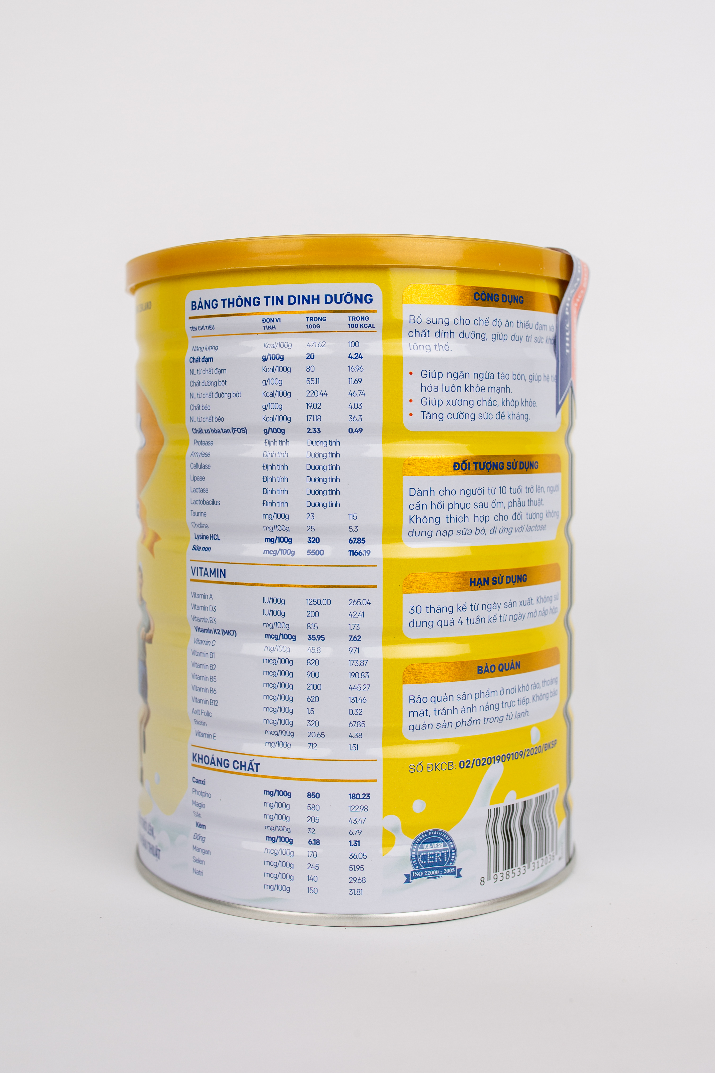 1. Thành phần: Sữa bột, Whey protein, Soy protein, Maltodextrin, Sữa non, L-Lysine HCL, FOS, Canxi Nano, Taurine, Choline, DHA, ARA, Vitamin (Vitamin A, Vitamin C, Vitamin D, Vitamin E, Vitamin D3, Vitamin K2,