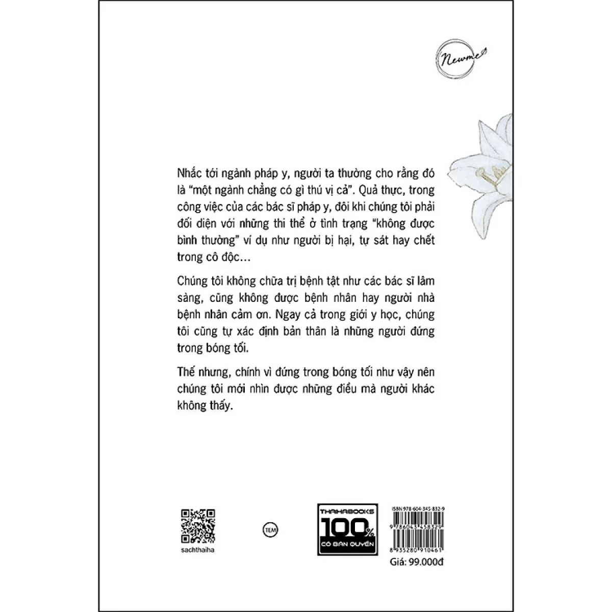Mọi người thường nghĩ pháp y là “một ngành chẳng có gì thú vị cả” và đôi khi còn hơi đáng sợ, bởi họ phải đối diện với những thi hài trong tình trạng “không được bình thường” ví dụ như người bị hại, tự sát hay chết trong cô độc… Họ không trị bệnh tật như các bác sĩ lâm sàng, cũng không được bệnh nhân hay người nhà bệnh nhân cảm ơn. Ngay cả trong giới y học, họ cũng tự xác định bản thân là những người đứng trong bóng tối. Dù vậy, việc tồn tại trong bóng tối cũng giúp họ nhìn ra được điều mà người khác không thấy được.