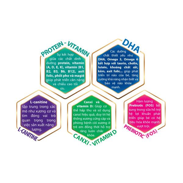 Omega 3 & Omega 6 Các dưỡng chất thiết yếu như DHA - TAURIN - CHOLIN - LUTEIN - AXIT FOLIC - LUTEIN - KHOÀNG CHẤT - Axít F giúp phát triển trí não của bé, tăng cường khả năng nhận biết và bảo vệ não khỏe mạnh.