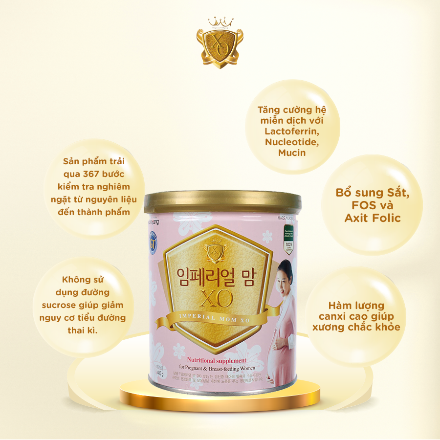 LƯU Ý: DATE sản phẩm 30/11/2025 Giới thiệu Sữa Bột Namyang Imperial Mom XO GT 400g là sữa dành cho mẹ bầu đến từ Tập đoàn Namyang nổi tiếng tại Hàn Quốc. Sữa Bầu XO Mom chứa 39 thành phần dưỡng chất, trải qua 367 bước kiểm tra nghiêm ngặt từ nguyên liệu đến thành phẩm, mang đến nguồn dinh dưỡng với hương vị thơm ngon dành cho mẹ đang mang thai & cho con bú. Sản phẩm giúp cung cấp cho cơ thể mẹ những dưỡng chất cần thiết để duy trì sức khỏe và nuôi dưỡng thai nhi. Đặc biệt, Vitamin K trong sữa có tác dụng chống xuất huyết não cho thai nhi. Ưu điểm vượt trội Ngăn ngừa loãng xương cho mẹ - Phát triển cấu trúc xương cho bé Sau khi sinh, xương của mẹ trở nên yếu đi. Vì vậy, việc cung cấp hàm lượng Canxi phù hợp là điều cần thiết nhất trong suốt thời gian thai kì. Với hàm lượng Canxi có trong sữa bầu XO Mom giúp mẹ ngăn ngừa loãng xương và phát triển cấu trúc xương cho bé. Bên cạnh đó, sữa tăng hợp chất CPP, Vitamin D và Khoáng chất giúp tăng cường khả năng hấp thu canxi hiệu quả nhất. Điều hoà hấp thu - Phòng chống táo bón thai kì Hỗn hợp đường Fructose-Oligisaccharide (FOS) có tác dụng thúc đẩy sự phát triển của hệ sinh vật có lợi và hạn chế khả năng hấp thu thức ăn của các vi sinh vật có hại trong đường ruột, từ đó giúp mẹ tăng cường khả năng hấp thu và tiêu hoá, chóng táo bón thai kì- một triệu trứng hay xảy ra đối với phụ nữ mang thai. Ngăn ngừa thiếu máu Trong suốt thời kì mang thai, thai nhi phát triển nhờ vào chất dinh dưỡng từ người mẹ cung cấp qua dẫn truyền máu. Do vậy, trong giai đoạn mang thai, mẹ bầu rất dễ bị thiếu máu, Sữa bầu XO Mom bổ sung sắt kết hợp cùng lượng Axit Folic được cung cấp theo tiêu chuẩn quốc tế sẽ giúp phòng ngừa thiếu máu, đồng thời phát triển hoàn chỉnh hệ thần kinh, chống dị tật ống thần kinh cho thai nhi. Tăng cường hệ miễn dịch cho mẹ trong thai kì và giai đoạn cho con bú Thành phần dinh dưỡng nổi trội là Lactoferin, β-Carotene, Nucleotides bổ sung dưỡng chất, tăng cường hoạt hoá chức năng miễn dịch, chống oxy hoá và phòng tránh nhiễm khuẩn cho mẹ trong suốt thời kì mang thai và cho con bú. Ngăn chặn stress và chống sạm nám da