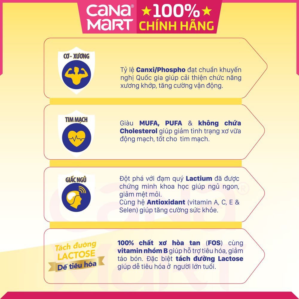 Công thức tách đường Lactose, cùng hệ chất xơ hòa tan (FOS/Inulin) giúp dễ tiêu hóa, hấp thu, phù hợp cho người lớn tuổi.