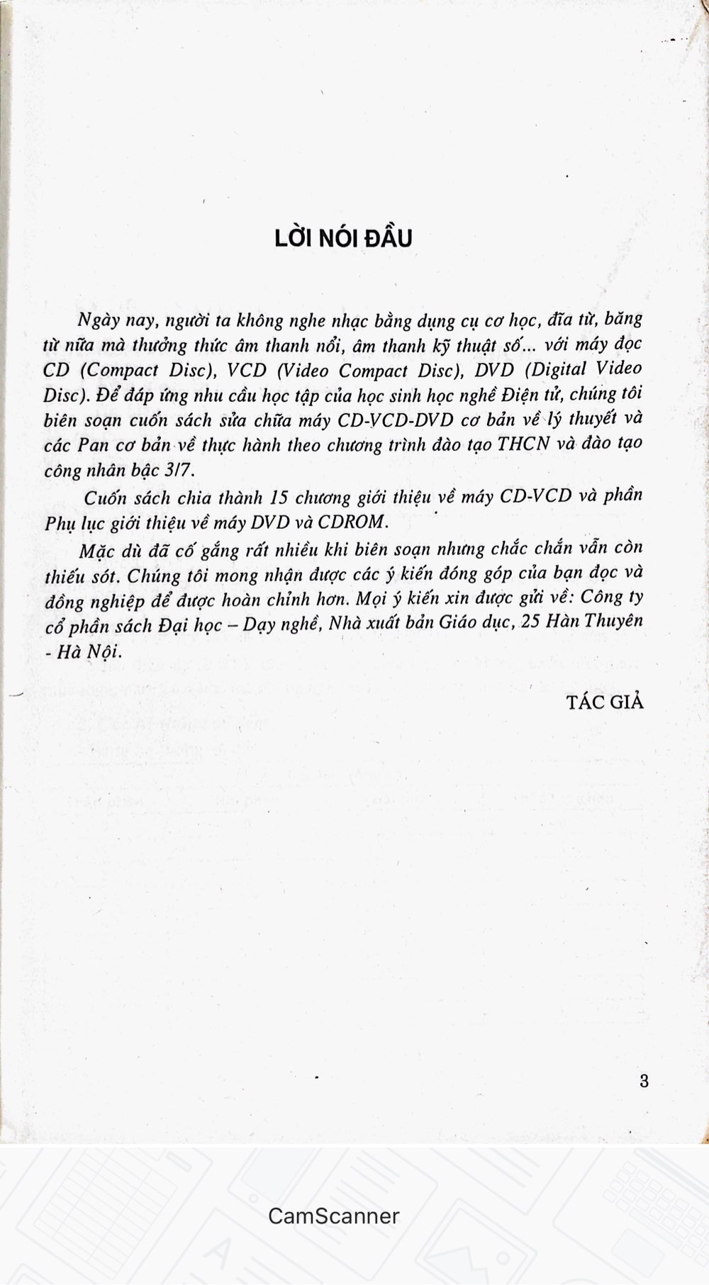 Ngày nay, người ta không nghe nhạc bằng dụng cụ cơ học, đĩa từ, băng từ nữa mà thưởng thức âm thanh nổi, âm thanh kỹ thuật số với máy đọc CD (Compact Disc), VCD (Video Compact Disc), DVD (Digital Video Disc). Để đáp ứng nhu cầu học tập của học sinh học nghề Điện tử, chúng tôi biên soạn cuốn sách sửa chữa máy CD-VCD-DVD cơ bản về lý thuyết và các Pan cơ bản về thực hành theo chương trình đào tạo THCN và đào tạo công nhân bậc 3/7. Cuốn sách chia thành 15 chương giới thiệu về máy CD-VCD và phần Phụ lục giới thiệu về máy DVD và CDROM. Mặc dù đã cố gắng rất nhiều khi biên soạn nhưng chắc chắn vẫn còn thiếu sót. Chúng tôi mong nhận được các ý kiến đóng góp của bạn đọc và đồng nghiệp để được hoàn chỉnh hơn. Mọi ý kiến xin được gửi về: Công ty cổ phần sách Đại học – Dạy nghề, Nhà xuất bản Giáo dục, 25 Hàn Thuyên Hà Nội. -