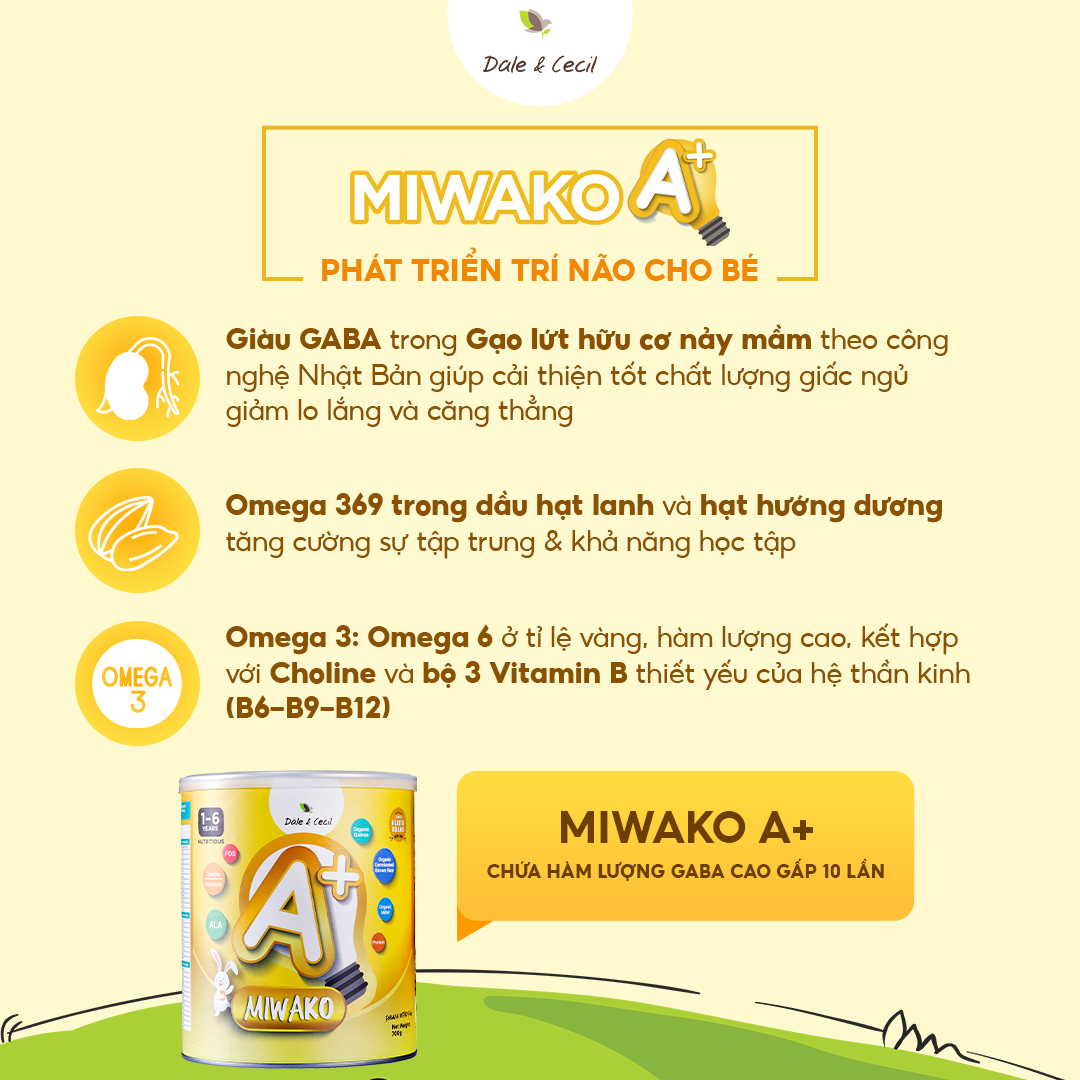 - GABA giúp bé có giấc ngủ ngon và sâu hơn: vì GABA ngăn cản sự hoạt động thái quá của các tế bào thần kinh, tăng cường cảm giác thư thái trong não bộ. Miwako có chứa thành phần Dầu hạt lanh & Dầu hướng dương: