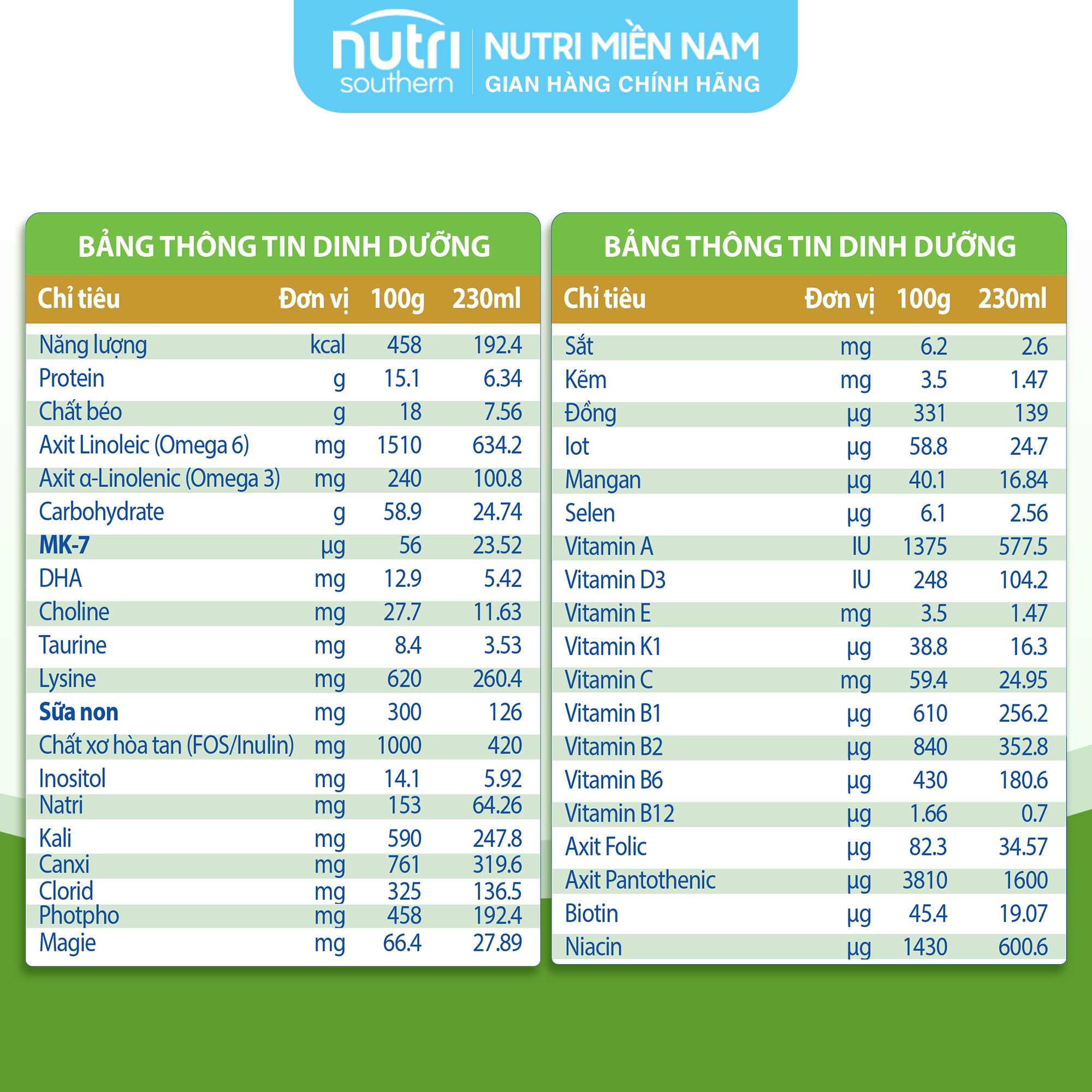 Sữa Tăng Chiều Cao Cho Bé ETOMIL 3X GROW - Giúp Bé Tăng Cường Phát Triển Chiều Cao, Bổ Sung Dinh Dưỡng Cân Bằng THÀNH PHẦN: Năng lượng(Energy) 458Kcal, Protein15g, Chất béo 18g, Axit A –Linolenic (Omega 3) 230mg, Carbohydrate 59g, MenaQ7 MK-7 50mcg, DHA12mg, Choline 30mg, Taurine 7.7mg, Lysine 620mg, Natri 162mg, Kali 588mg, Canxi 761mg, Clorid 337mg,