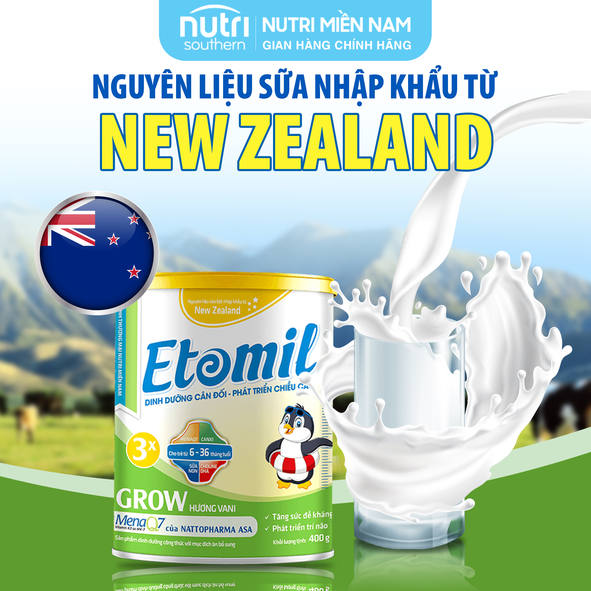 Sữa Tăng Chiều Cao Cho Bé ETOMIL 3X GROW - Giúp Bé Tăng Cường Phát Triển Chiều Cao, Bổ Sung Dinh Dưỡng Cân Bằng THÀNH PHẦN: Năng lượng(Energy) 458Kcal, Protein15g, Chất béo 18g, Axit A –Linolenic (Omega 3) 230mg, Carbohydrate 59g, MenaQ7 MK-7 50mcg, DHA12mg, Choline 30mg, Taurine 7.7mg, Lysine 620mg, Natri 162mg, Kali 588mg, Canxi 761mg, Clorid 337mg, Photpho 463mg, Magie 61.9mg, Sắt 5.2mg, Kẽm 3.1mg, Vitamin A 1320IU, Vitamin D3 237UI, Vitamin E 4.3mg,…   CÔNG DỤNG SẢN PHẨM: ETOMIL 3X GROW là sản phẩm dinh dưỡng dành cho trẻ từ 6-36 tháng tuổi. Dùng cho chế độ ăn hằng ngày, giúp trẻ phát triển thể chất và trí não, đặc biệt là phát triển chiều cao ETOMIL 3X GROW có những công dụng nổi trội: -PHÁT TRIỂN HỆ XƯƠNG: Bổ sung canxi giúp phát triển hệ xương, Vitamin D3 kích thích hấp thu Canxi và Photpho, giúp xương phát triển, rắn chắc. Đặc biệt bổ sung MenaQ7 (MK-7) giúp tăng quá trình Carboxyl hóa (kích hoạt) Osteocalcin – chất có khả năng vận chuyển Canxi tạo xương. -TĂNG SỨC ĐỀ KHÁNG: Kẽm có vai trò điều hòa chức năng hơn 200 Enzyme trong cơ thể, giúp cơ thể loại bỏ các chất độc. Selen giúp chống oxy hóa, kháng độc. Vitamin A giúp tăng khả năng miễn dịch, giúp các tế bào bị tổn thương. Vitamin C giúp kích thích hoạt động miễn dịch. -PHÁT TRIỂN TRÍ NÃO: Bổ sung DHA cần thiết cho sự phát triển não bộ, hoàn thiện hệ thần kinh. Choline tham gia tổng hợp chất truyền xung động thần kinh và tăng cường trí nhớ.   ĐỐI TƯỢNG SỬ DỤNG: Trẻ từ 6 – 36 tháng tuổi.   HUỚNG DẪN SỬ DỤNG: Pha 4 muỗng gạt (tương đương với 42g) với 200ml nước chín ấm (50oC) được 1 ly khoảng 230ml. Uống 2-3 ly mỗi ngày hoặc theo hướng dẫn của cán bộ y tế. Chú ý: Sản phẩm sau khi pha nên cho bé ăn ngay và dùng hết trong vòng 1 giờ. Không cho bé ăn lại phần thừa của bữa trước.   BẢO QUẢN: -Bảo quản nơi khô ráo, sạch sẽ, thoáng mát, tránh ánh nắng trực tiếp. Lon sữa đã mở phải được đóng kín và sử dụng hết trong vòng 3 tuần.