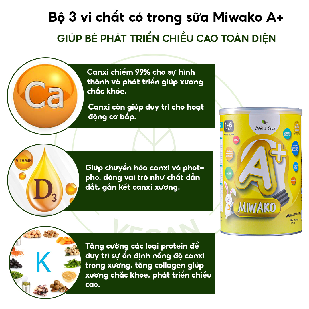 - Bộ ba vi chất trong sữa Miwako a+ giúp bé tăng chiều cao vượt trội: canxi, vitamin D3, vitamin K