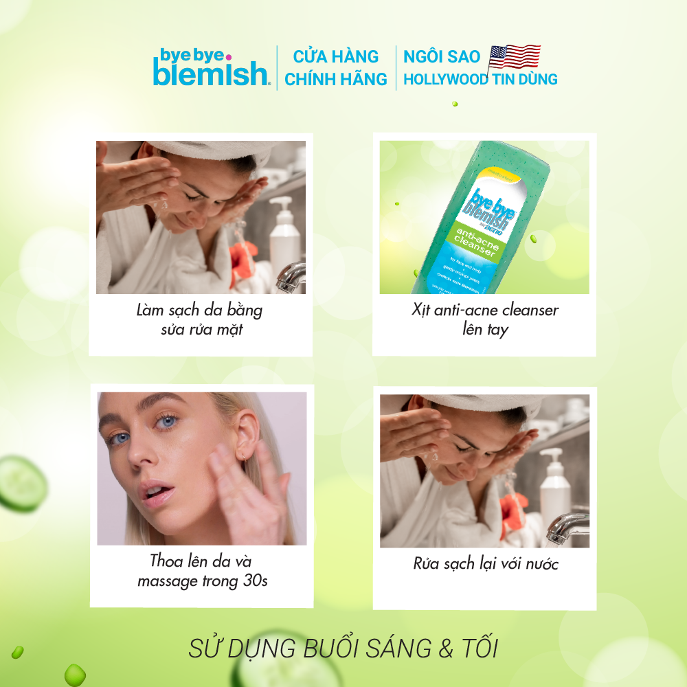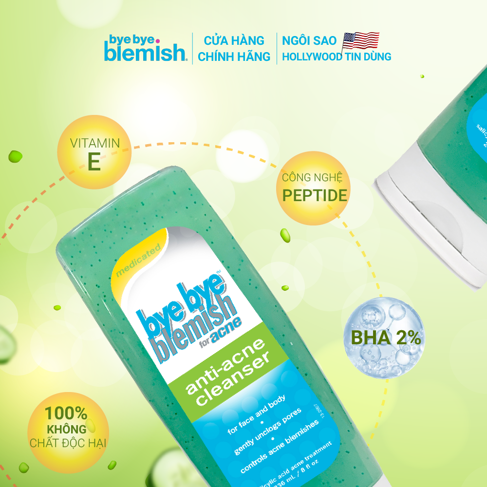 Mua tại TiktokLàn da sạch khỏe là bước đầu tiên giúp ngăn ngừa và ngăn chặn những phiền hà của mụn trứng cá. Bye Bye Blemish Anti-Acne Cleanser là sữa rửa mặt dịu nhẹ, tinh khiết, thấm sâu vào lỗ chân lông, làm sạch bụi bẩn, lớp trang điểm. Cho cảm nhận tức thì làn da mát lạnh, thông thoáng với công thức Menthol (hương bạc hà) sau khi vừa sử dụng sản phẩm. Thành phần tẩy da chết Salicylic Acid (BHA 2%) giúp lỗ chân lông thông thoáng, tẩy da chết nhẹ nhàng không gây khô, bong tróc. LỢI THẾ ĐẶC BIỆT