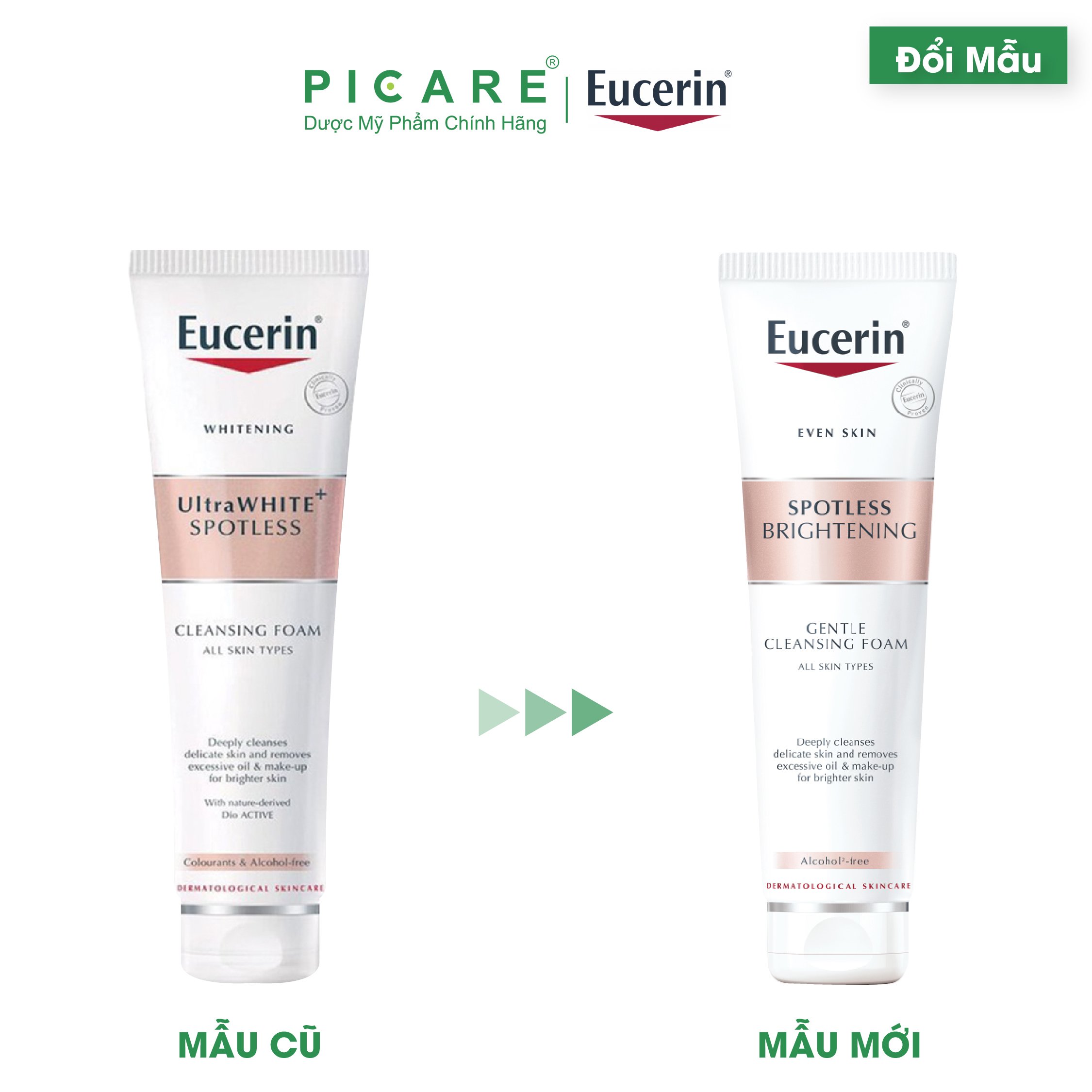- Sữa Rửa Mặt Trắng Da Eucerin Cleasing Foam giúp làm sạch sâu, dịu nhẹ và hỗ trợ làm sáng da, giảm đốm nâu, tàn nhang