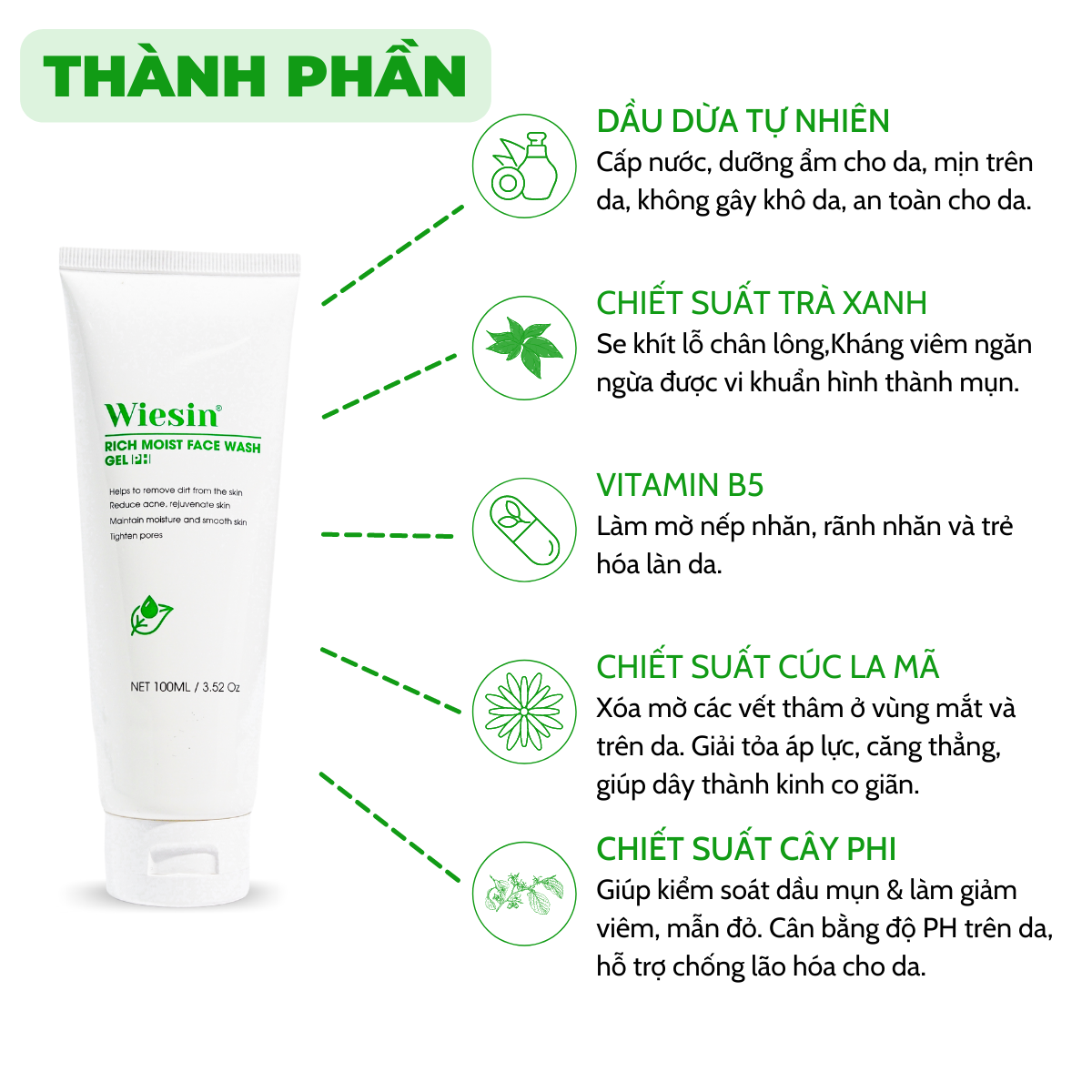 Mua tại TiktokSữa rửa mặt không bọt dưỡng ẩm cho da khô và da nhạy cảm Wiesin Rich Moist Face Wash Gel 100ml - WS01 1.CÔNG DỤNG SỮA RỬA MẶT DƯỠNG ẨM WIESIN: