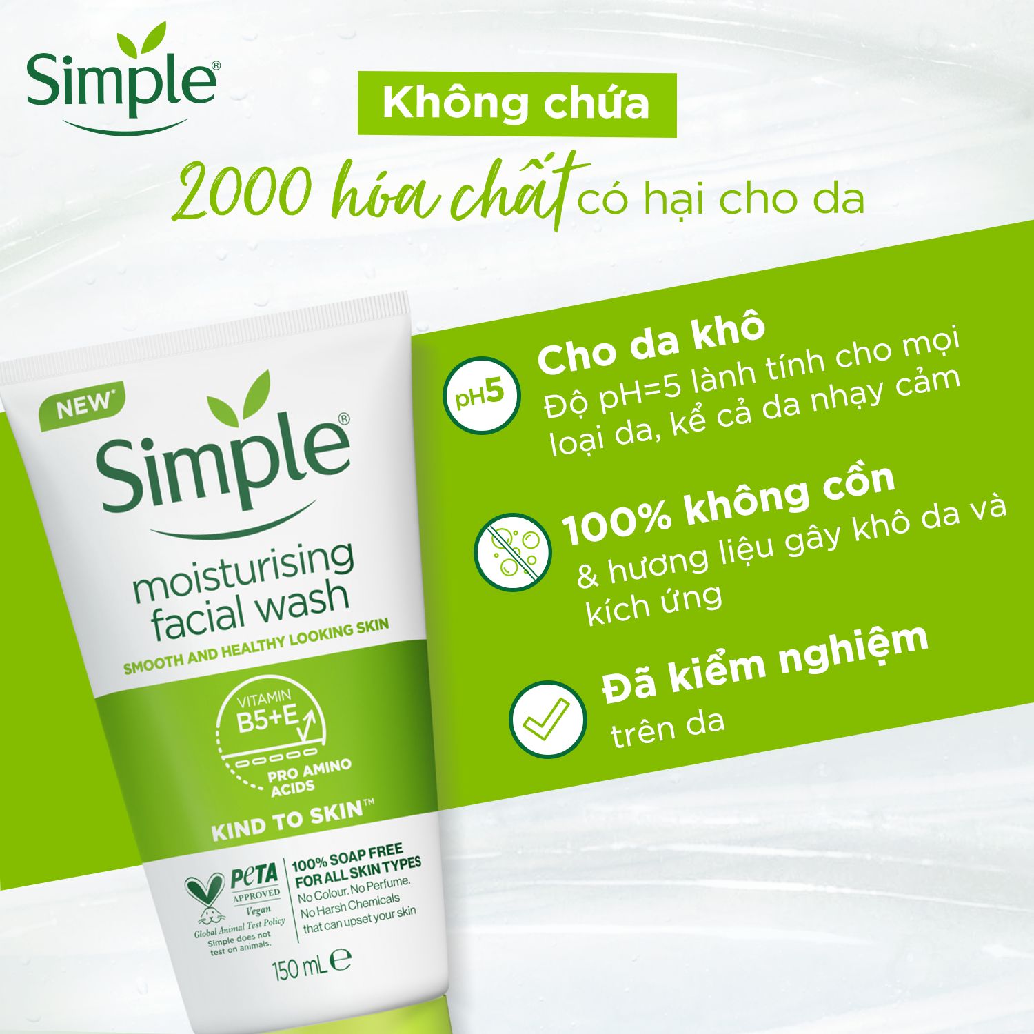 Sữa Rửa Mặt Simple Trắng Moisturising Facial Wash 150ml KHÔNG CỒN Cho DA KHÔ Da Nhạy Cảm Bong Da