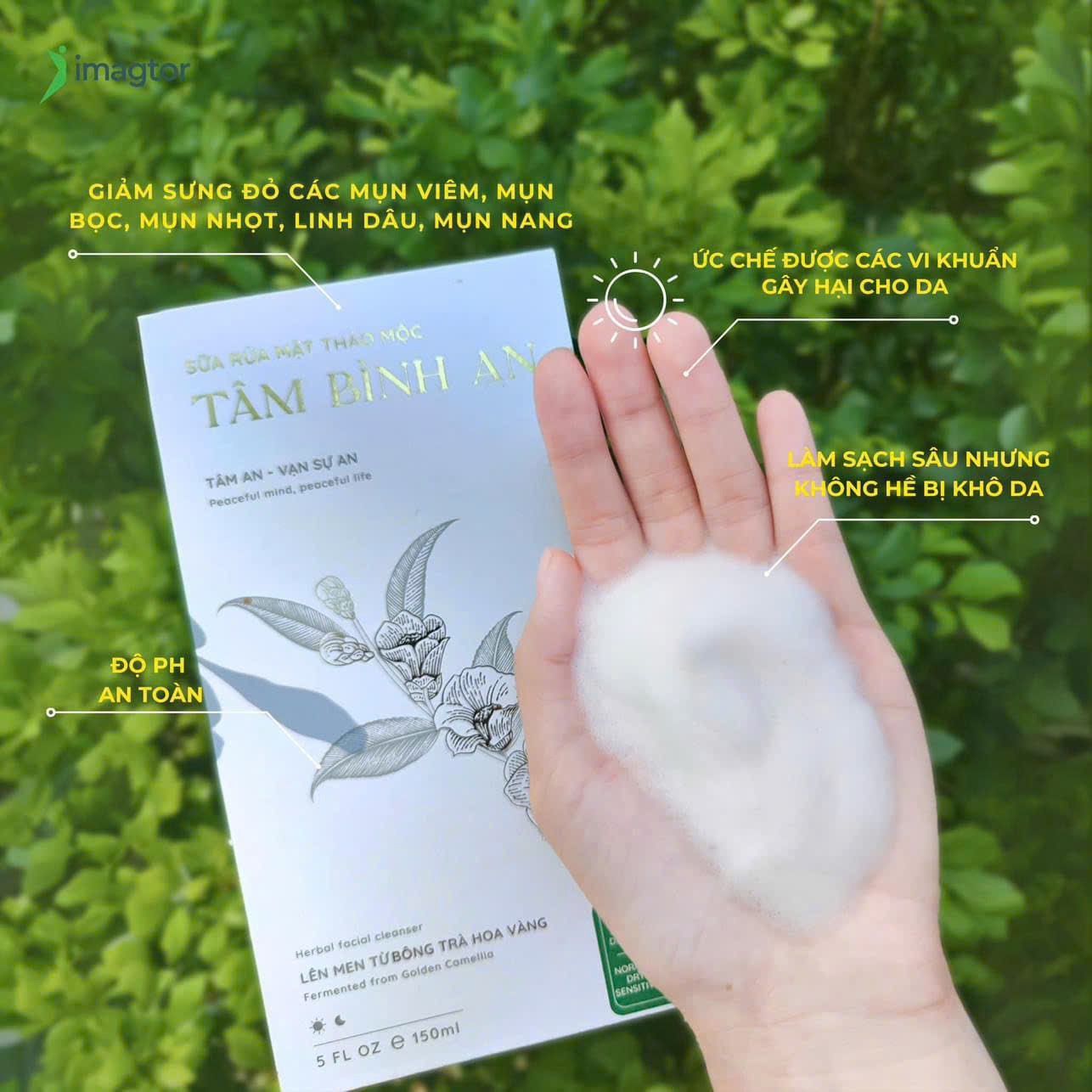 Sữa rửa mặt thảo mộc Tâm Bình An gồm các thành phần chủ yếu từ thiên nhiên, chiết xuất từ Trà Hoa Vàng mang tới các công dụng như làm sạch sâu, làm thông thoáng lỗ chân lông, duy trì độ ẩm tự nhiên cho da, chống oxy hóa vượt trội giúp ngăn ngừa mụn trên da, giúp da luôn tươi sáng và mềm mại.