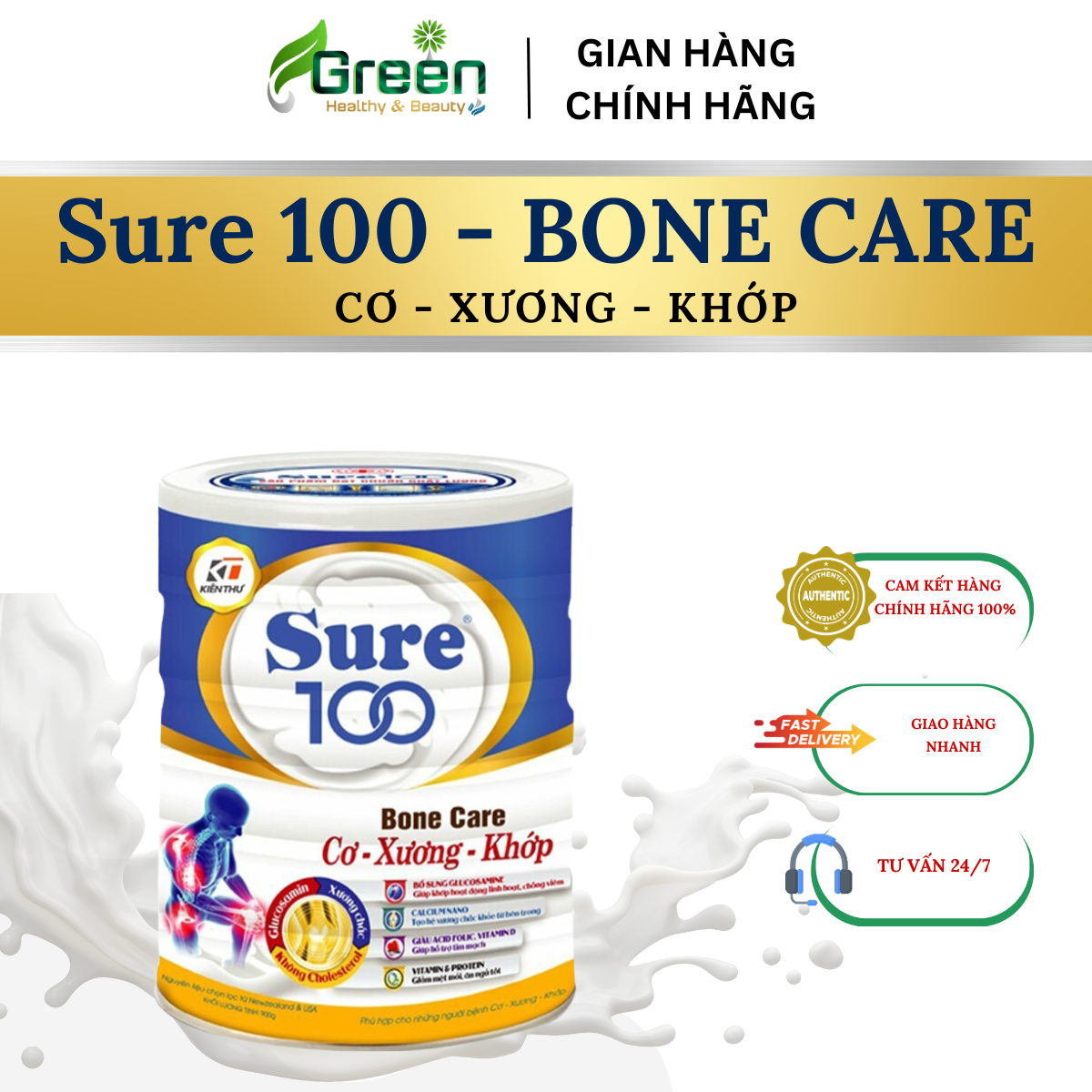 Sữa bột Sure 100 - Bone Care (Cơ - Xương - Khớp) bổ sung Canxi, các vitamin A, vitamin D, Magie và các khoáng chất cần thiết giúp cơ thể khỏe mạnh, tăng cường sức đề kháng, phòng ngừa loãng xương và giúp hệ tim mạch khỏe mạnh. Sữa bột Sure 100 - Bone Care (Cơ - Xương - Khớp) phù hợp cho người lớn, người có cholesterol trong máu cao, người bệnh loãng xương. Đặc biệt được bổ sung thêm HMO tăng cường hấp thu các chất dinh dưỡng và MK7 tăng cường sức khỏe của xương, ngăn ngừa và hỗ trợ loãng xương, gãy xương bằng cách giúp hấp thu vận chuyển tối đa Canxi từ máu vào xương nhờ MK7 kích hoạt các Osteocalcin giúp xương chắc khoẻ, dẻo dai tăng độ đàn hồi của xương khớp, giúp các dưỡng chất thẩm sâu vào tận lớp trong của xương, nuôi dưỡng xương chắc khỏe từ bên trong.