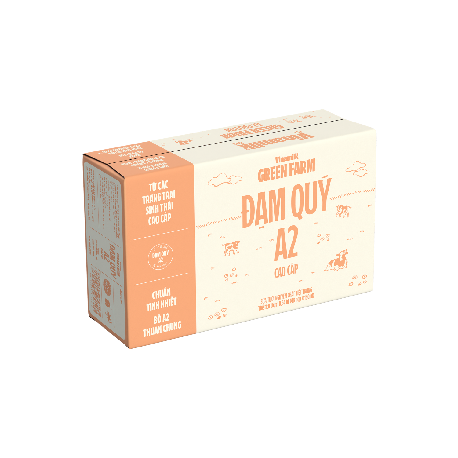 - Sàng lọc di truyền - Chỉ giữ cá thể bò A2 Vinamilk xét nghiệm gen và mẫu sữa từ bò A2 thông qua hệ thống viện kiểm nghiệm BVAQ Food Testing Laboratory, trực thuộc Bureau Veritas. Đạm quý A2 có cấu trúc gần đạm sữa mẹ Đạm quý A2 beta casein có cấu trúc gần với đạm beta casein trong sữa mẹ, không bị chuyển hoá thành hoạt chất có thể gây kích ứng đường tiêu hoá (β-casomorphin-7 (BCM7)). Dễ tiêu hóa - Dễ hấp thu Luôn được ưu tiên sử dụng khi chăm bẵm những hệ tiêu hóa non nớt và khó tính. Đạm A2 beta casein dễ tiêu hóa, dễ hấp thu hơn đạm A1 beta casein. Công nghệ kép đột phá Hút chân không sữa giảm đến 50% gốc oxy tự do, khoá tươi tức thời, loại bỏ các tạp vị, lưu giữ tối đa hương cỏ hoa và vị thơm tự nhiên của sữa. 10 năm hành trình trang trại giảm phát thải Carbon Đến 100% nước thải xử lý được tái sử dụng, 17% năng lượng mặt trời, thu hồi và sử dụng đến 90% năng lượng sinh học. Danh sách Không đồ sộ KHÔNG dùng hormone tăng trưởng KHÔNG dư lượng thuốc bảo vệ thực vật KHÔNG dư lượng thuốc trừ sâu KHÔNG dùng chất bảo quản KHÔNG dư lượng kim loại nặng () Phù hợp tiêu chuẩn Clean Label Project Certified và QCVN 5-1:2010/BYT Bò A2 thuần chủng Đạm quý A2 có cấu trúc gần đạm sữa mẹ Dễ tiêu hóa Dễ hấp thu Chuẩn tinh khiết Trang trại sinh thái Công nghệ đột phá hút chân không kép KHÔNG dùng hormone tăng trưởng KHÔNG dư lượng thuốc bảo vệ thực vật KHÔNG dư lượng thuốc trừ sâu Không phải Sữa tươi nào cũng như nhau Vinamilk Green Farm A2 Sản xuất tươi tinh khiết ngay tại Việt Nam - Rút ngắn thời gian đến tay bạn Công nghệ kép đột phá hút chân không khóa tươi tự nhiên Nông nghiệp sinh thái giảm phát thải carbon KHÔNG dùng hormone tăng trưởng KHÔNG dư lượng thuốc bảo vệ thực vật KHÔNG dư lượng thuốc trừ sâu KHÔNG dùng chất bảo quản KHÔNG dư lượng kim loại nặng Sữa A2 nội địa Sữa A2 nhập khẩu