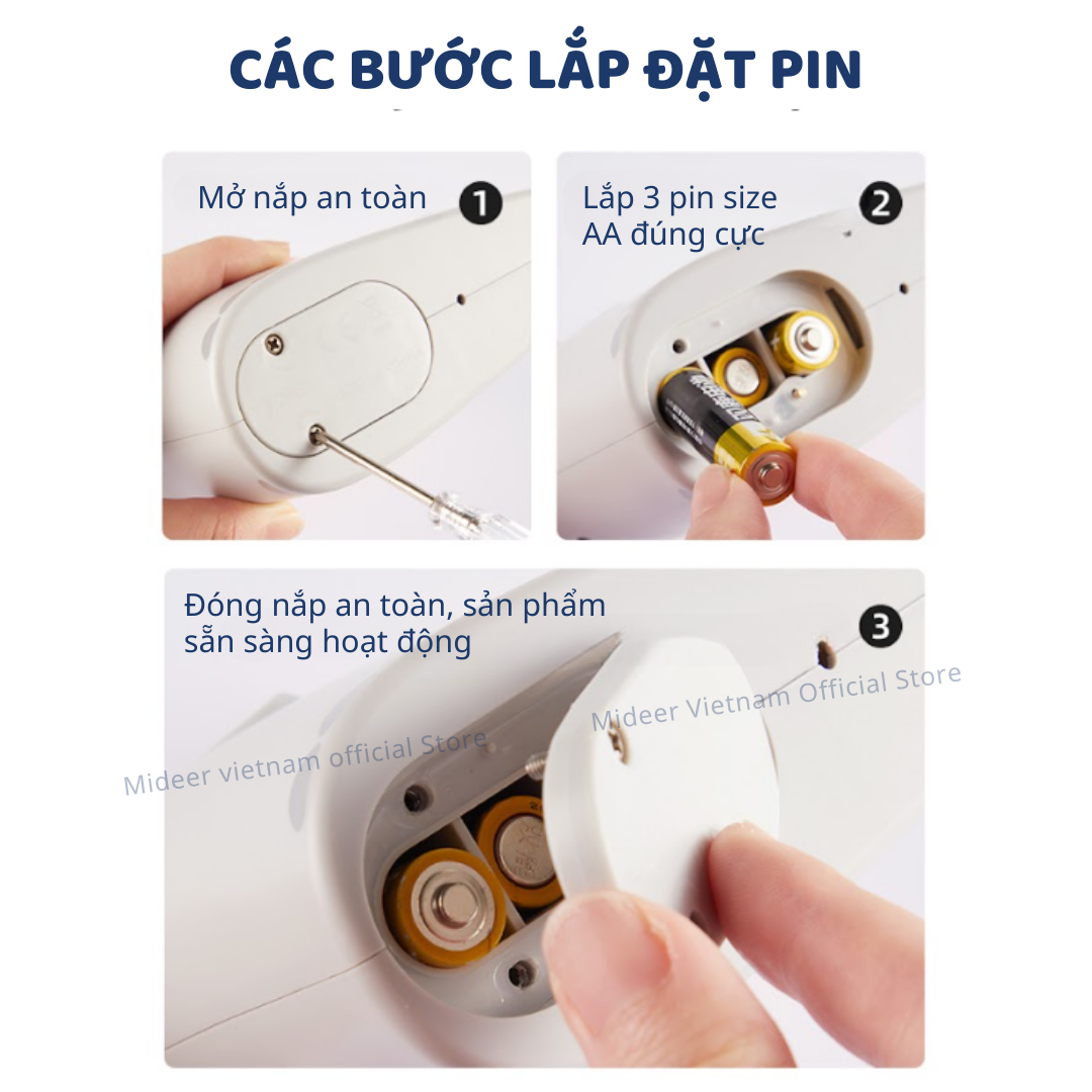 - CÁC BƯỚC LẮP ĐẶT PIN Bước 1:Mở nắp an toàn Bước 2: Lắp 3 pin size AA đúng cực. Bước 3: Đóng nắp an toàn, sản phẩm sẵn sàng hoạt động.