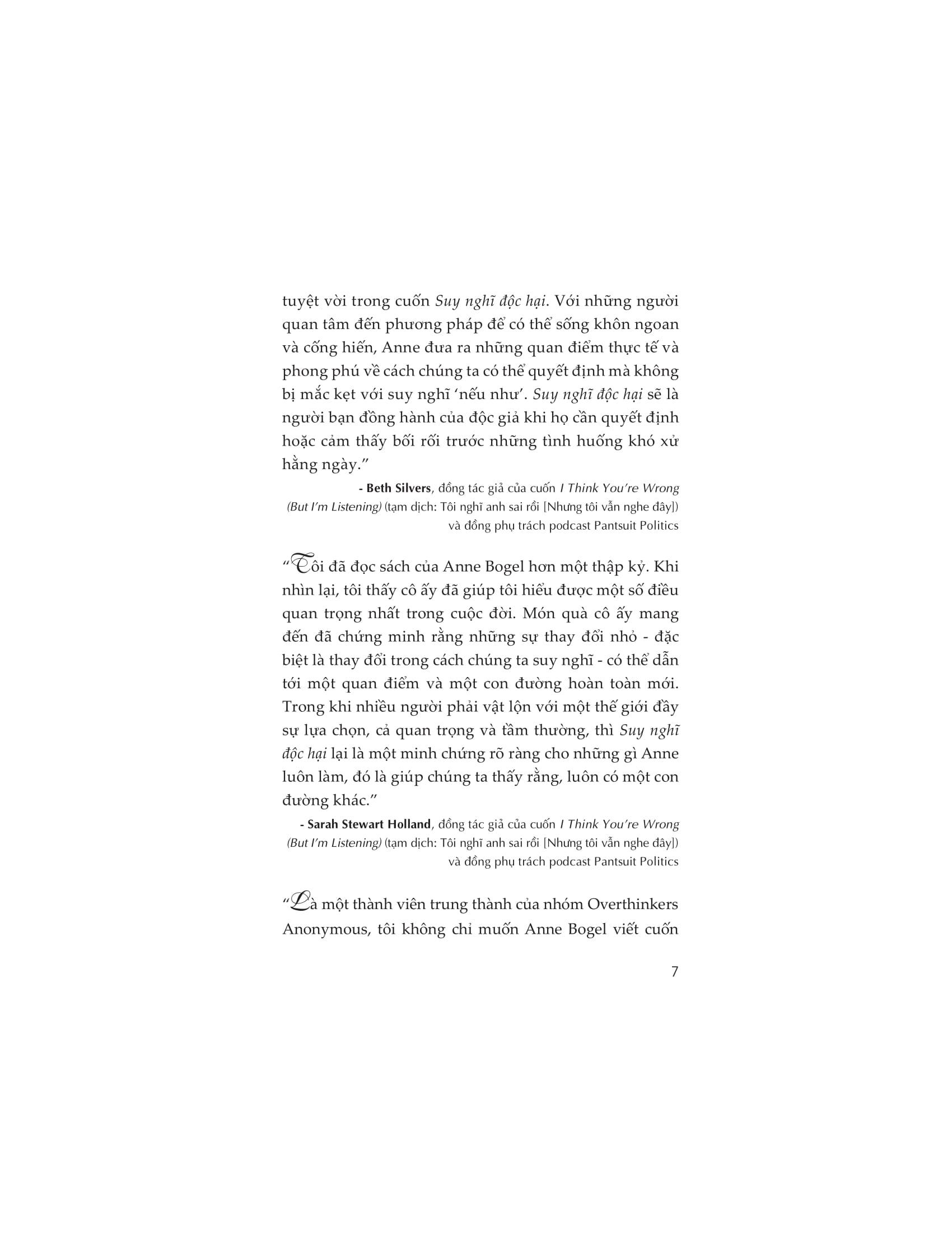 “Việc suy nghĩ quá nhiều về những quyết định và vấn đề có thể phí hoài vô số thời gian của bạn. Trong cuốn sách tích cực và truyền cảm hứng này, Anne đã cung cấp cho độc giả một cách để thoát khỏi cạm bẫy tinh thần đó và giải phóng không gian cho những cuộc phiêu lưu khác trong cuộc sống.”