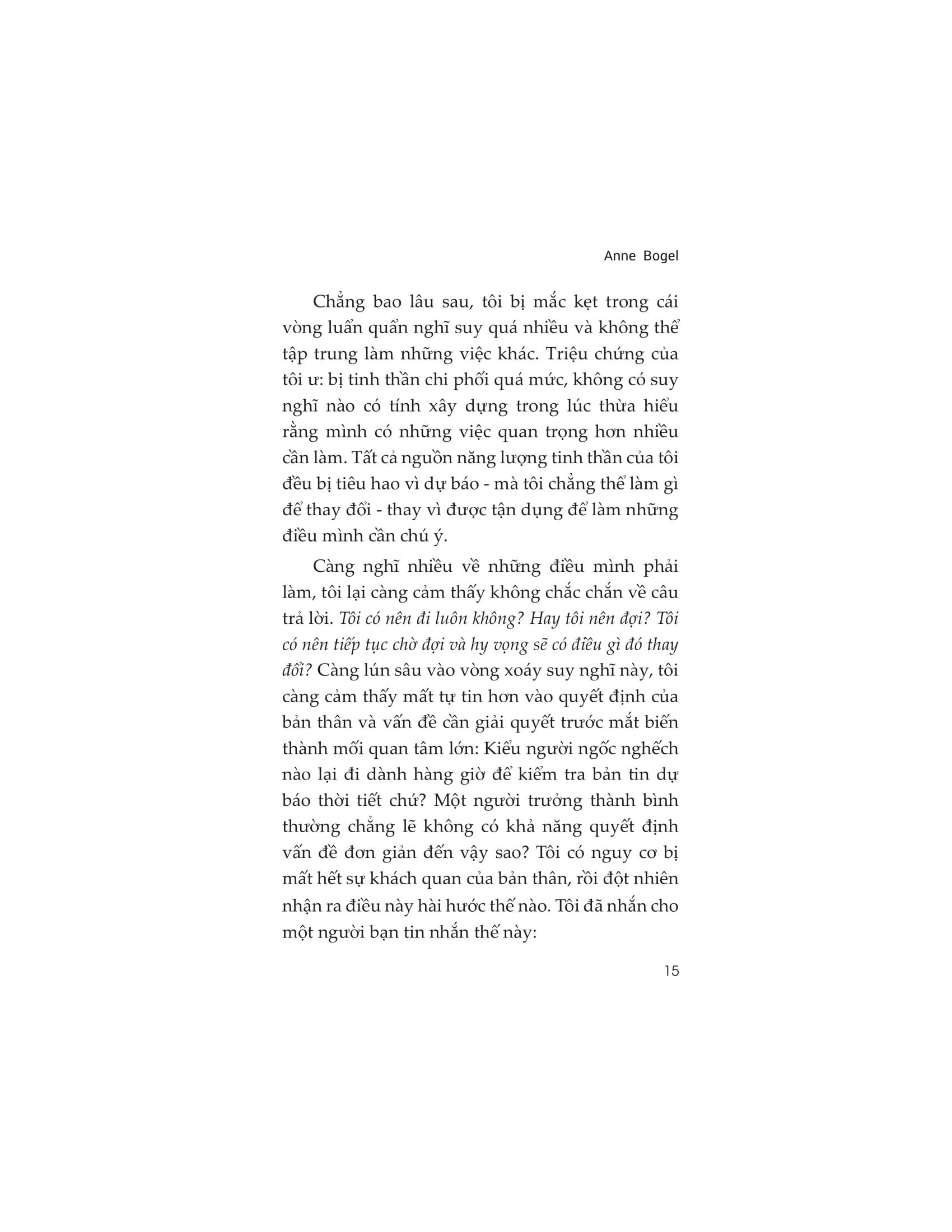 thể xảy ra trong tương lai. Việc cứ nghĩ ngợi quanh đi quẩn lại làm chúng ta cảm thấy không thoải mái chút nào, nhưng nếu không có những nguyên tắc hoặc triết lý nhất quán hướng dẫn, chúng ta dường như không thể tự cứu rỗi chính mình. Dù những mối bận tâm của bạn lớn hay nhỏ thì chúng đều có điểm chung: những suy nghĩ đó lặp đi lặp lại, không hề lành mạnh và hết sức vô ích.
