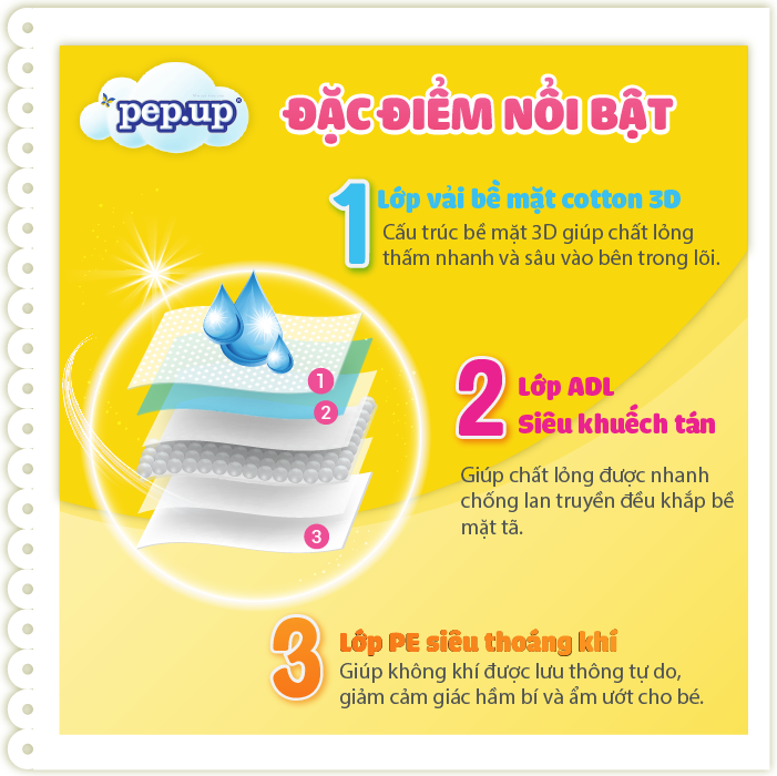 Thành phần: Vải không dệt, hạt siêu thấm, PE thoáng khí, bông, giấy, lớp thấm hút thông minh,…