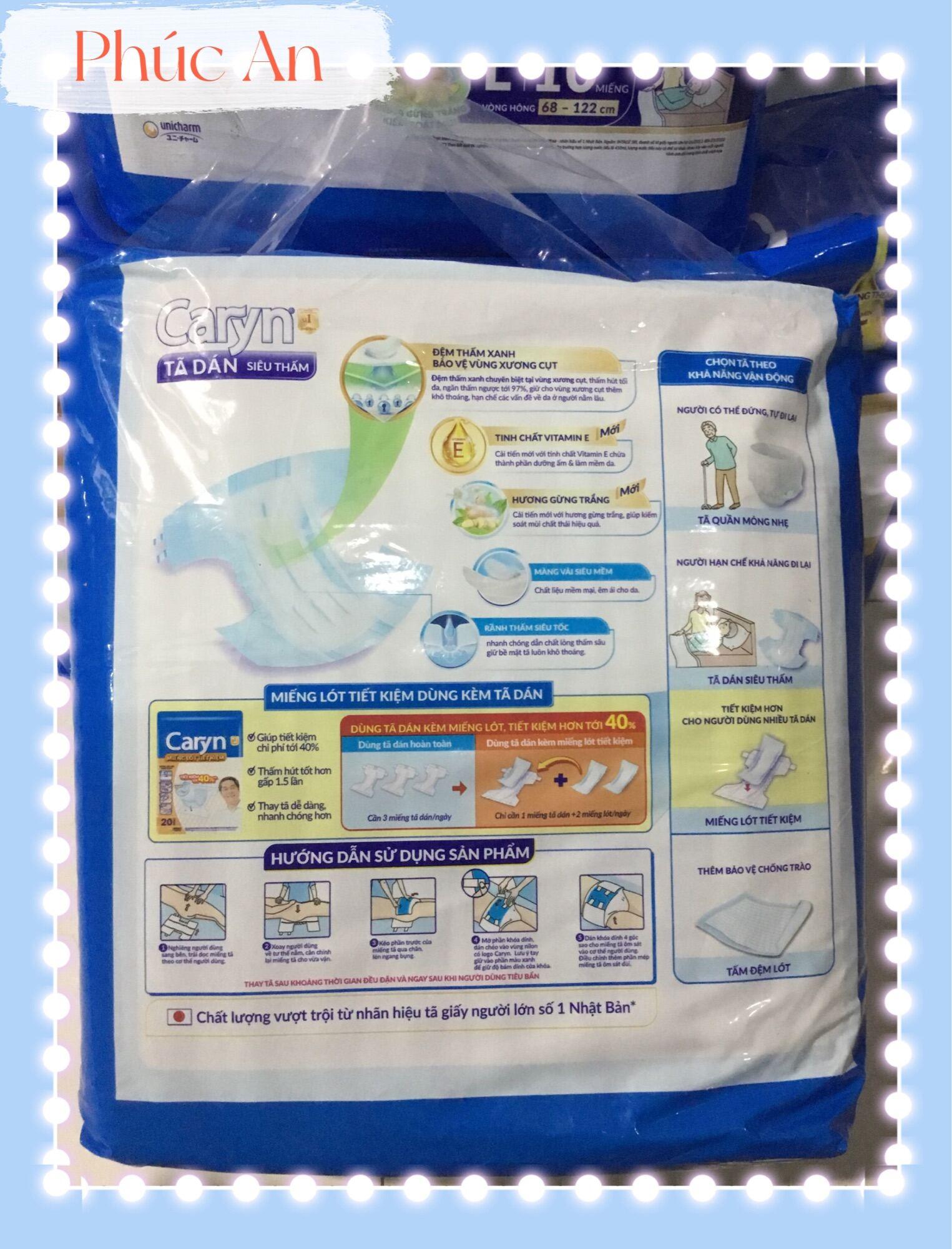 Tã dán Người Lớn Caryn Size L10 Siêu thấm Đệm thấm xanh bảo vệ vùng xương cụt (10 Miếng) Tã dán Siêu thấm Caryn L10 (mẫu cũ Caryn ML10) cải tiến mới với "Đệm thấm
