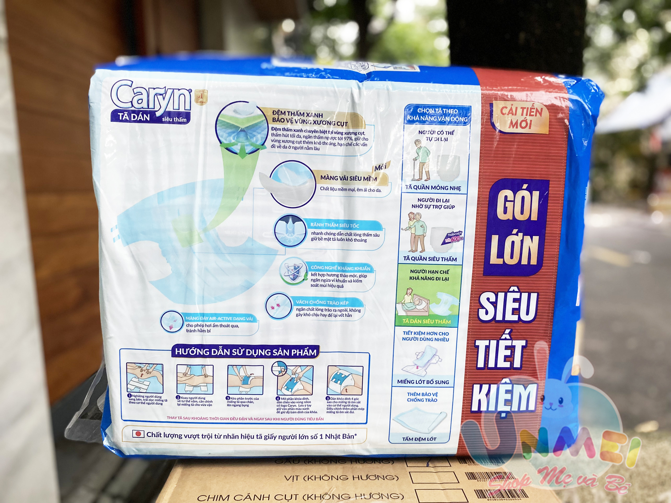 ã dán người lớn Caryn M40 - gói lớn siêu tiết kiệm (gồm 40 miếng) Tã dán Siêu thấm Caryn cải tiến mới với “Đệm thấm xanh" chuyên biệt tại vùng xương cụt, với các