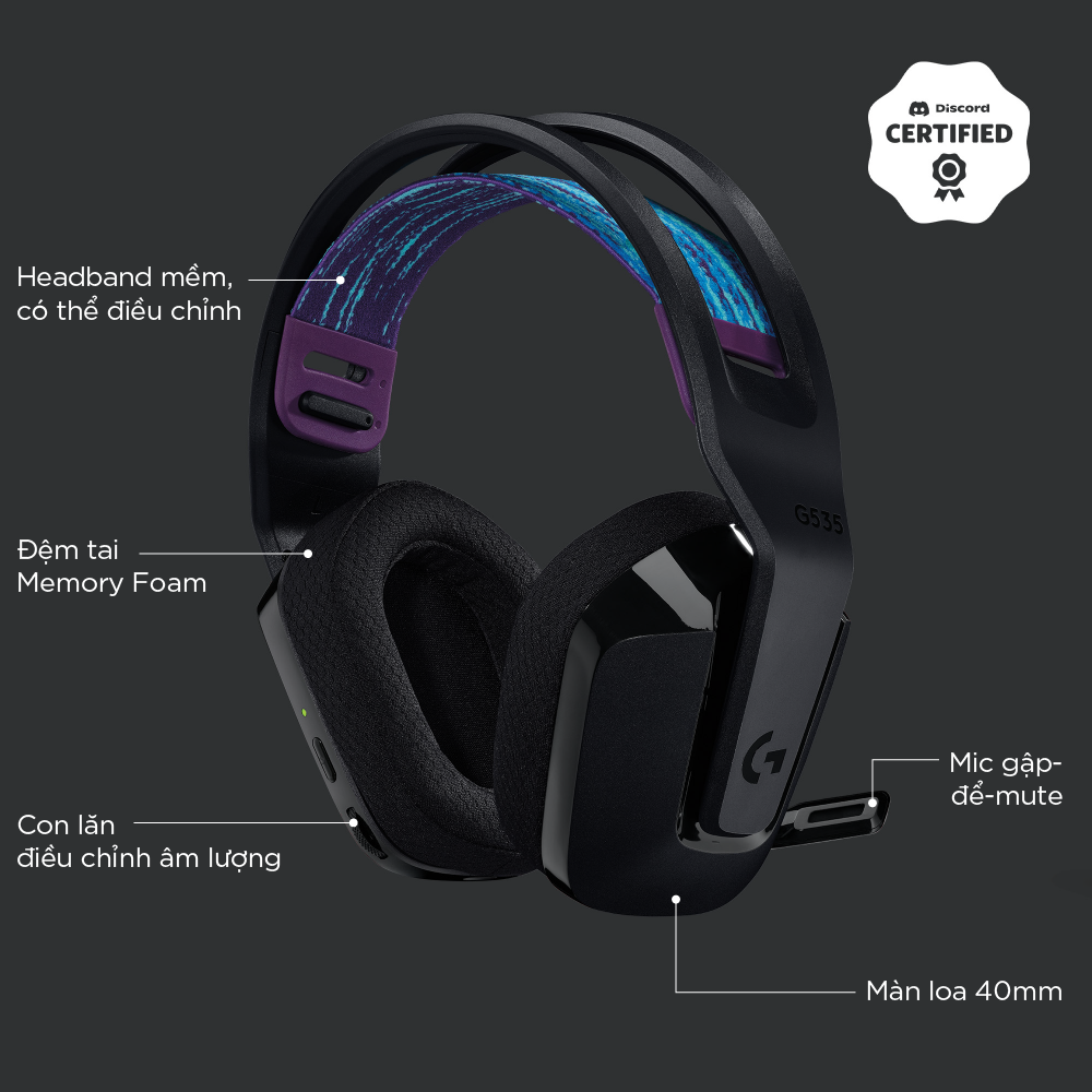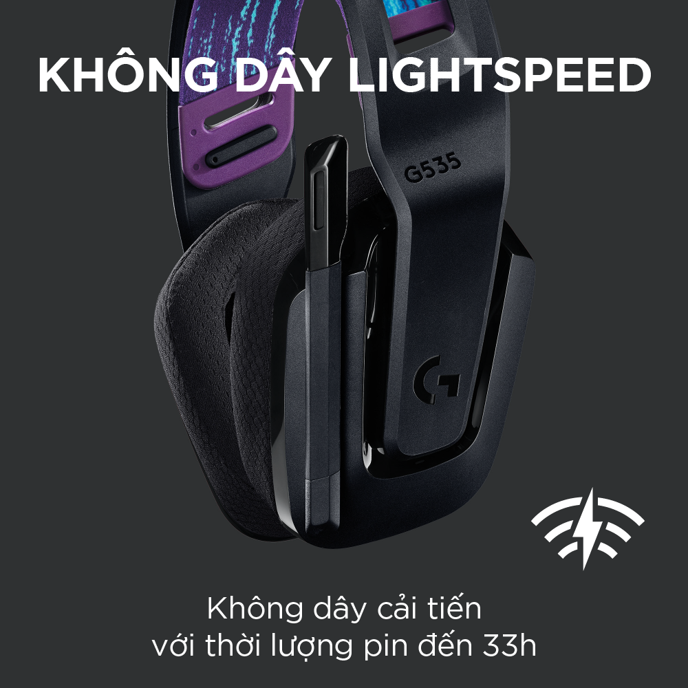 Tai nghe game không dây Lightspeed Logitech G535 - Trọng lượng nhẹ, âm thanh nổi, tương thích PC, PS4, PS5, Mic gấp để tắt tiếng Tai nghe chơi game không dây G535 đem đến cho bạn hiệu suất, sự tự do và thoải mái trong tất cả những buổi chơi game. Công nghệ LIGHTSPEED không dây tiên tiến có độ trễ thấp đem lại sự tự do không dây đáng tin cậy lên tới 12 m và thời lượng pin đáng kinh ngạc 33 giờ.(1) Màng loa 40 mm đem lại âm thanh nổi rõ ràng, trong trẻo và sâu lắng. Chỉ nặng 236 gram, quai đeo có thể điều chỉnh và chụp tai bằng cao su non mềm mại đảm bảo sự thoải mái suốt ngày. Các nút điều khiển trên tai nghe cho phép bạn nhanh chóng tăng âm lượng trò chơi hoặc âm nhạc. Chỉ cần gấp lên để tắt tiếng và giấu gọn gàng. G535 đã được chứng nhận Discord để đảm bảo đem lại hiệu suất giao tiếp rõ như pha lê với âm thanh và độ rõ ràng giọng nói tuyệt vời. - LIGHTSPEED không dây cho kết nối nâng cao, đáng tin cậy. - Thời lượng pin để chơi game là 33 giờ - Chỉ 236 gram - Thiết kế co dãn với đệm tai làm từ cao su non đem lại sự thoải mái suốt cả ngày - Điều khiển âm lượng trên tai và mic gấp-để-tắt tiếng - Màng loa 40 mm cho âm thanh nổi rõ ràng, trong trẻo - Được chứng nhận Discord cho cuộc giao tiếp rõ ràng - Hoạt động với PC và PlayStation LIGHTSPEED không dây: Công nghệ không dây LIGHTSPEED cấp độ chuyên nghiệp đem lại thời lượng pin 33 giờ (1) và sự tự do không dây đáng tin cậy lên tới 12 m Trọng lượng nhẹ và thoải mái Nặng chỉ 236 gram, G535 nhỏ và nhẹ hơn G733; quai đeo co dãn hai mặt giúp phân phối trọng lượng và có thể điều chỉnh cho độ vừa vặn tùy chỉnh Cắm vào là sử dụng được: Tối ưu hóa thời gian chơi của bạn với tai nghe chơi game dễ dùng, cắm vào là sử dụng; G535 sử dụng kết nối USB tương thích với PC và các thiết bị chơi game PlayStation Tương thích PC và máy chơi game: PlayStation 5, PlayStation 4 Điều khiển trên khung tai nghe Nút xoay âm lượng nằm trực tiếp trên khung tai nghe, để nhanh chóng tăng âm lượng trò chơi, âm nhạc hay cuộc trò chuyện của bạn; chỉ cần gấp micrô lên để tắt tiếng và cất gọn Màng loa 40 mm Với màng loa neodymium 40 mm, chiếc tai nghe chơi game không dây này đem lại âm thanh nổi rõ ràng, trong trẻo và sâu lắng, giúp cho trò chơi của bạn trở nên chân thực hơn. Thoải mái suốt ngày Chụp tai bằng cao su non thoải mái và vật liệu vải lưới thể thao lý tưởng khi sử dụng lâu dài G535 đã được chứng nhận Discord để đảm bảo đem lại hiệu suất giao tiếp rõ như pha lê với âm thanh và độ rõ ràng giọng nói tuyệt vời YÊU CẦU HỆ THỐNG: Cổng USB cho LIGHTSPEED: Windows 10, macOS X 10.14 trở lên Kết nối Internet cho Phần mềm G HUB của Logitech (2) TRONG HỘP GỒM - Tai nghe chơi game G535 - Quai đeo mềm hai mặt (đi kèm) -