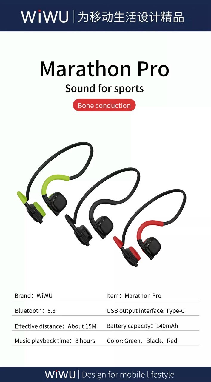 Tai #Wiwu Marathon pro Thương hiệu: #Wiwu Màu sắc: đen, xanh, đỏ Kết nối Bluetooth V5 3 Pin: 140mAh Thời gian nghe: 6 giờ Thời gian sạc: 1.5H Tai nghe có chất lượng âm thanh độ nét cao, cuộc gọi rõ ràng Kiểu dáng thể thao, ngoại hình 3 bảo vệ thính giác không đau tai