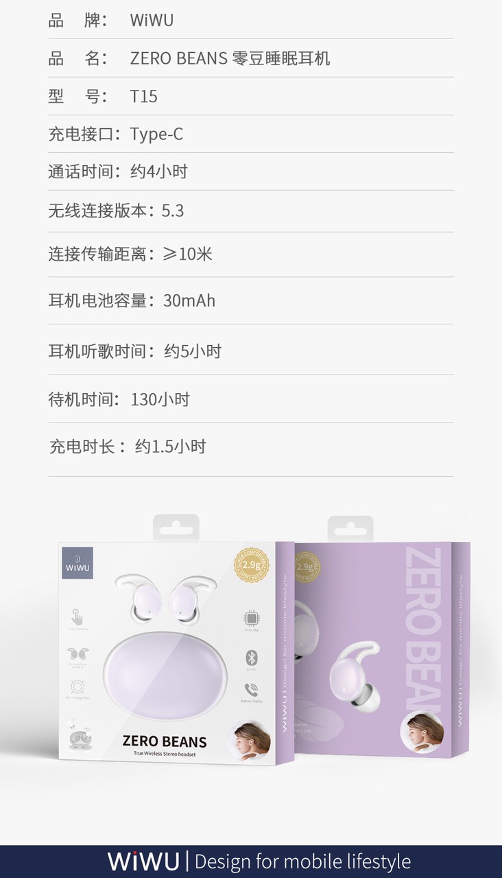 ✨Tai nghe Wiwu ZERO BEANS T15 cho các thiết bị di động thiết kế tai nhỏ, nhẹ, giảm tiếng ồn vật lý, đeo lâu không bị đau tai - Hàng chính hãng