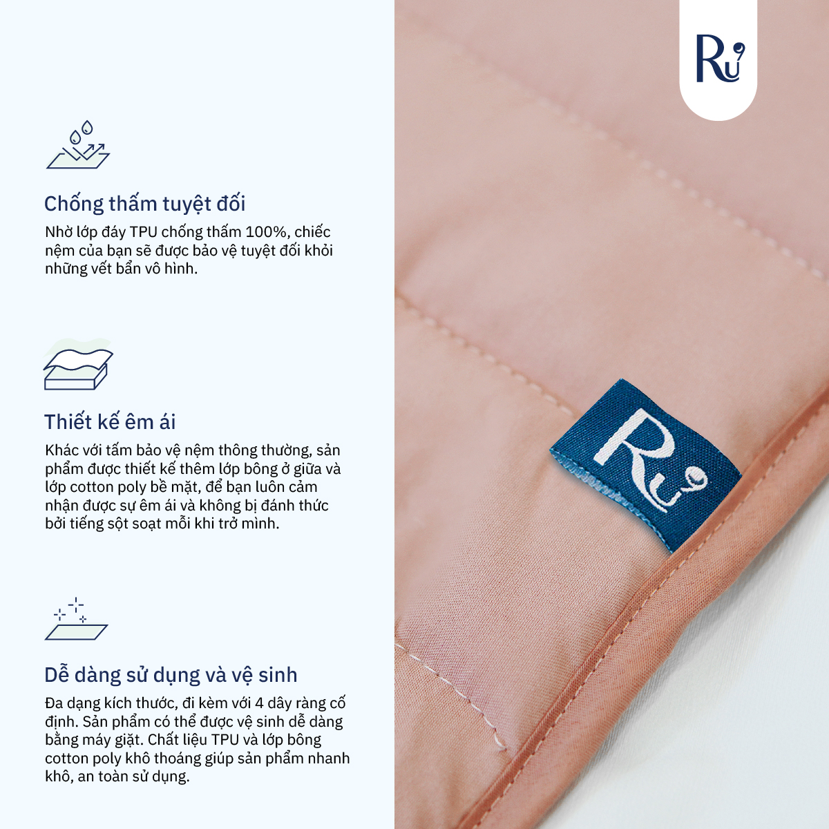 Tấm Bảo Vệ Nệm (Mattress Protector) Ru9 Chống Thấm Tuyệt Đối, Thông Thoáng - Mềm Mại | 6 Kích Thước | Nhiều Màu Sắc ---------------------------------------------------- *Chi tiết sản phẩm: Thông tin sản phẩm: Tấm Bảo Vệ Nệm Ru9 vừa hỗ trợ giữ chiếc nệm luôn sạch sẽ, vừa đảm bảo đem đến sự êm ái, dễ chịu cho giấc ngủ của bạn. Không chỉ ngăn cản làm bẩn nệm, “tấm khiên” này còn bảo vệ bạn khỏi sự lo lắng không đáng có. - Quy cách đóng gói: Sản phẩm được cuộn lại và bỏ vào túi vải nhỏ gọn và tiện lợi - Sản phẩm gồm: 1 tấm bảo vệ Ru9 và túi để đựng ---------------------------------------------------- *Hướng dẫn bảo quản: - Giặt tấm bảo vệ định kì với máy giặt để giữ vệ sinh. - Giặt ở chế độ giặt nhẹ, không sấy nóng. ---------------------------------------------------- *Hướng dẫn sử dụng: - Khi sử dụng, gỡ dây cột túi tấm bảo vệ và lấy tấm bảo vệ ra - Có thể cuộn lại và bỏ vào túi để giữ vệ sinh nếu không sử dụng - Để ở trên mặt nệm và ở dưới ga giường ---------------------------------------------------- *Lưu ý: - Tránh tiếp xúc trực tiếp với nắng gắt ---------------------------------------------------- *Cam kết với khách hàng: Miễn phí vận chuyển với đơn hàng trên 1.500.000đ ---------------------------------------------------- *Chính sách giao hàng: Giao tiêu chuẩn (trừ Chủ Nhật): - Hồ Chí Minh và Hà Nội (2 ngày) - Tỉnh (4 - 5 ngày) - Khu vực cận HCM và HN (2-3 ngày) Cần thêm thông tin và hỗ trợ