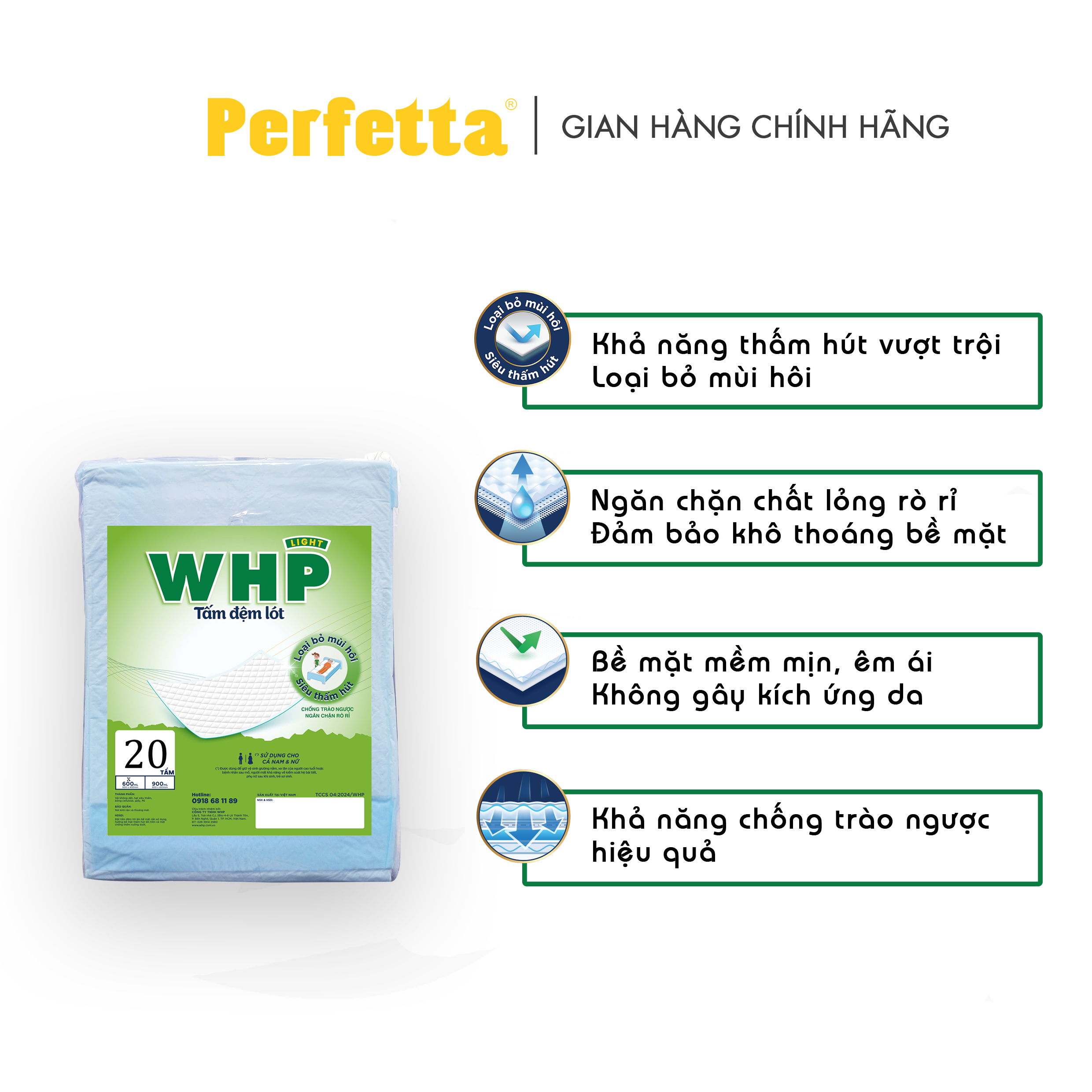 Tấm Đệm Lót WHP Underpad, Siêu Thấm Hút, Chống Trào Ngược, Khử Mùi Hiệu Quả Size 60x45 cm (8 miếng/túi)Tấm Đệm Lót WHP Underpad, Siêu Thấm Hút, Chống Trào Ngược, Khử Mùi Hiệu Quả Size 60x45 cm (8 miếng/túi)