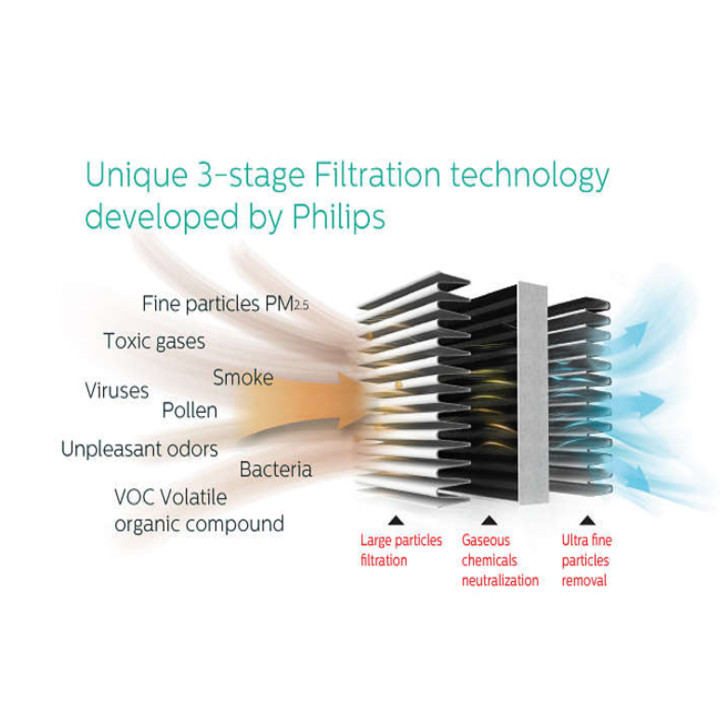- Khả năng lọc hạt hiệu suất cao của Philips loại bỏ các hạt bụi siêu nhỏ bên trong xe hơi, bao gồm khói thuốc lá, phấn hoa, bụi, hạt cỡ PM2.5, các vi khuẩn và vi rút lan truyền trong không khí nhỏ cỡ 0.3 micrômet, với Tỷ lệ không khí sạch nhận được (CADR) là 30m3/giờ (99.9% khả năng lọc các hạt nhỏ hơn 0.3µm; khoảng 3m3)